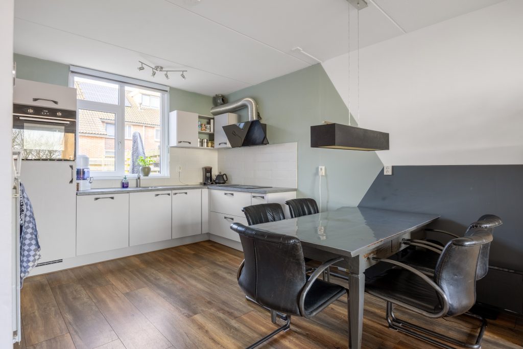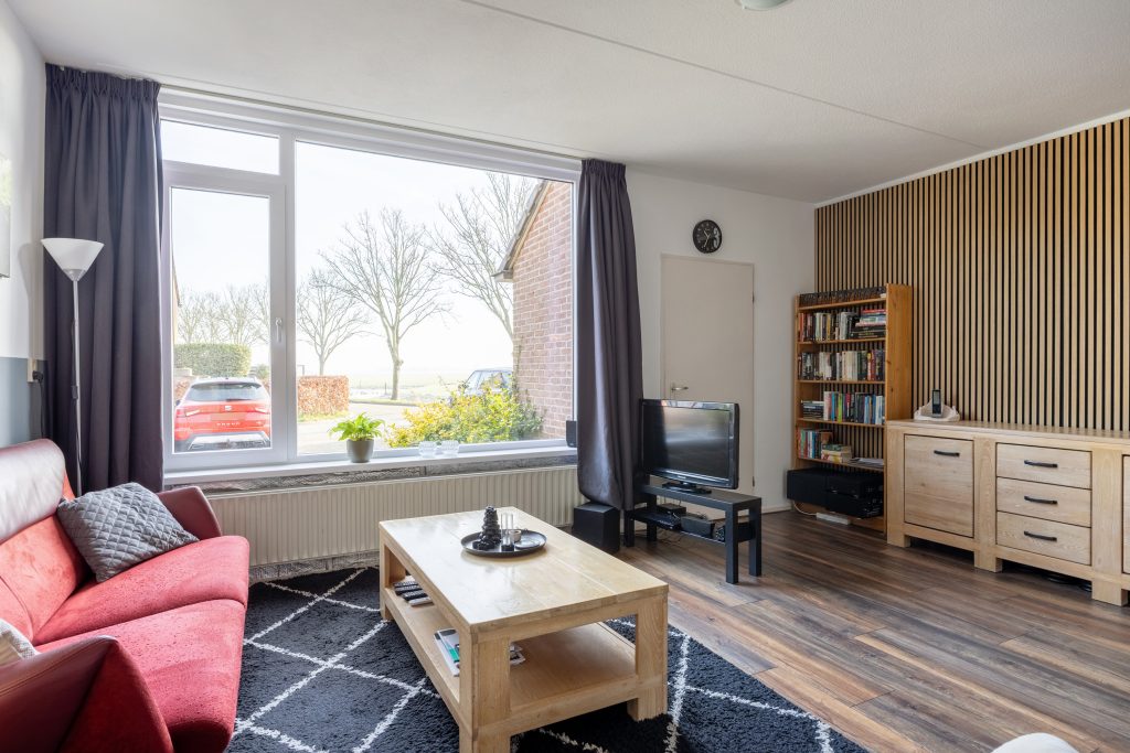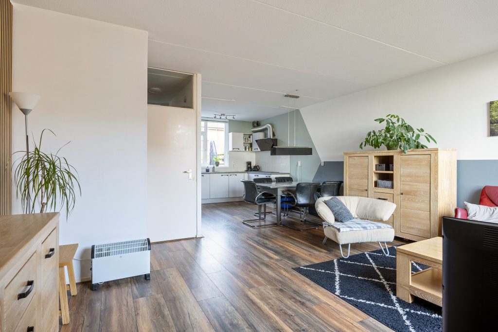 Vanuit de entree/hal met moderne meterkast, kom je in de lichte woonkamer van ca. 35m² met aan de voorzijde vrij zicht over de landerijen en aan de tuinzijde de open keuken met moderne keukeninrichting uit 2021. De keukeninrichting is voorzien van een inductie kookplaat, oven, een vaatwasser en een koelkast. Vervolgens kom je in de tussenhal met trapopgang en keurig toilet en aansluitend de bijkeuken met deur naar de tuin, vliering met bergruimte, witgoedaansluiting en omvormer zonnepanelen.