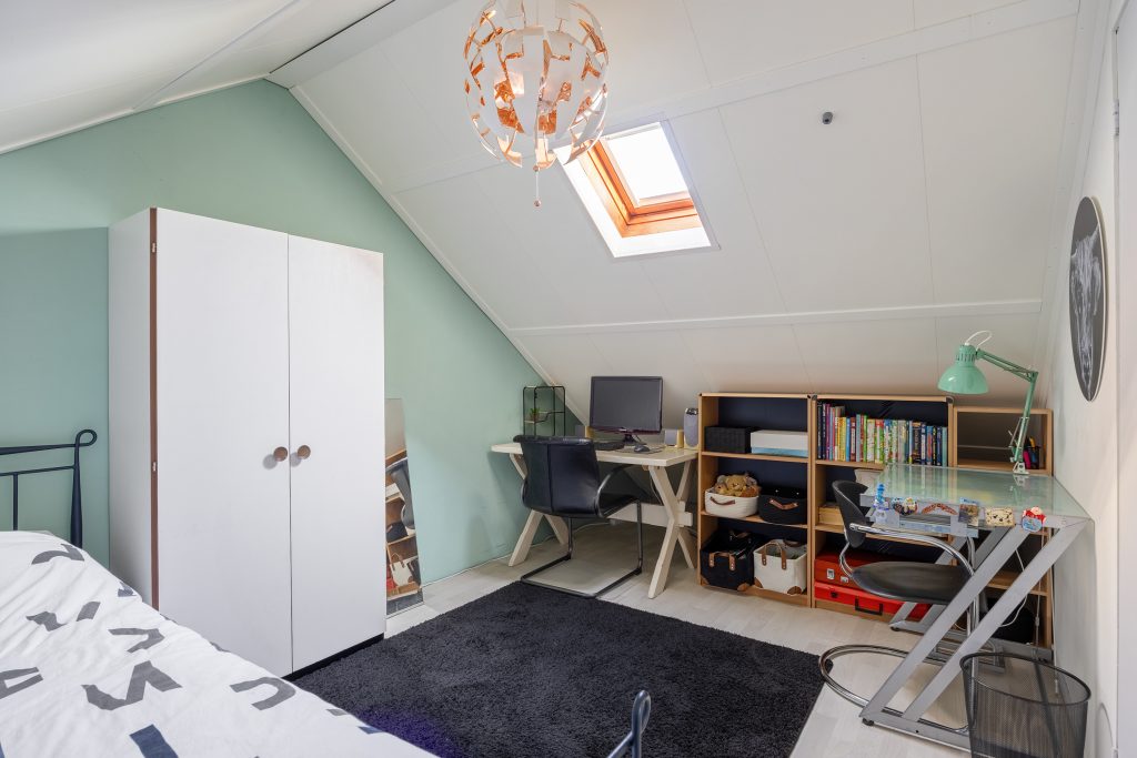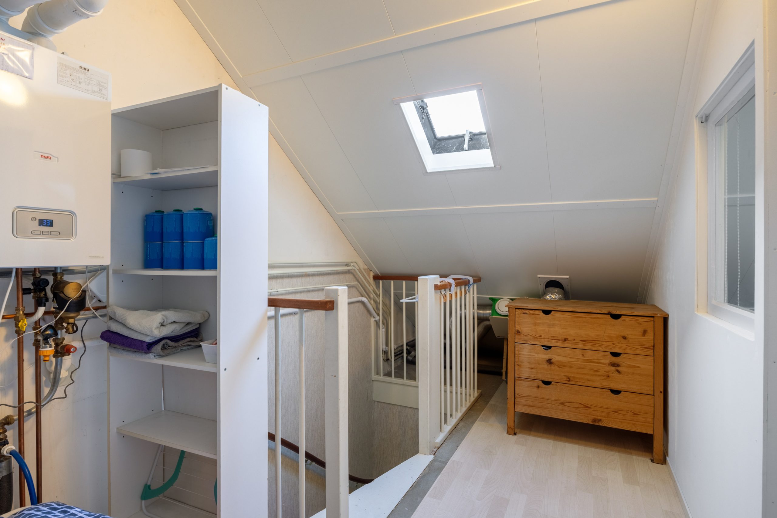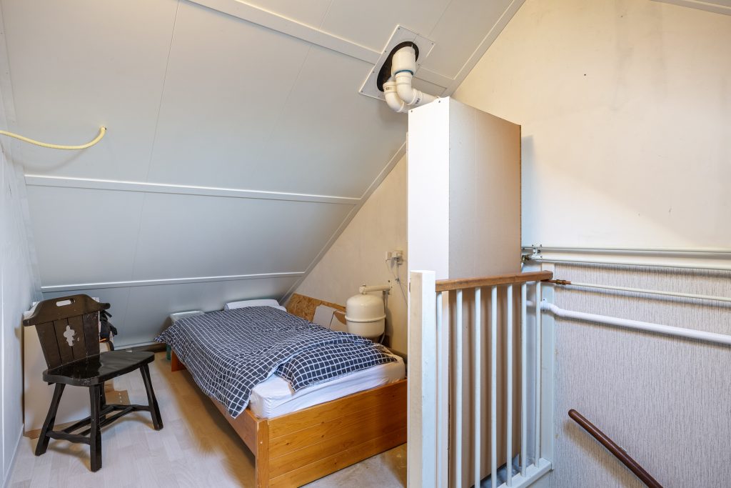 De 2e verdieping bereik je middels een vaste trap vanaf de overloop en bestaat uit een overloop met bergruimte, opstelplaats voor de cv-ketel en een fraaie 4e slaap-/zolderkamer van ca. 8m² met dakraam en extra bergruimte.
