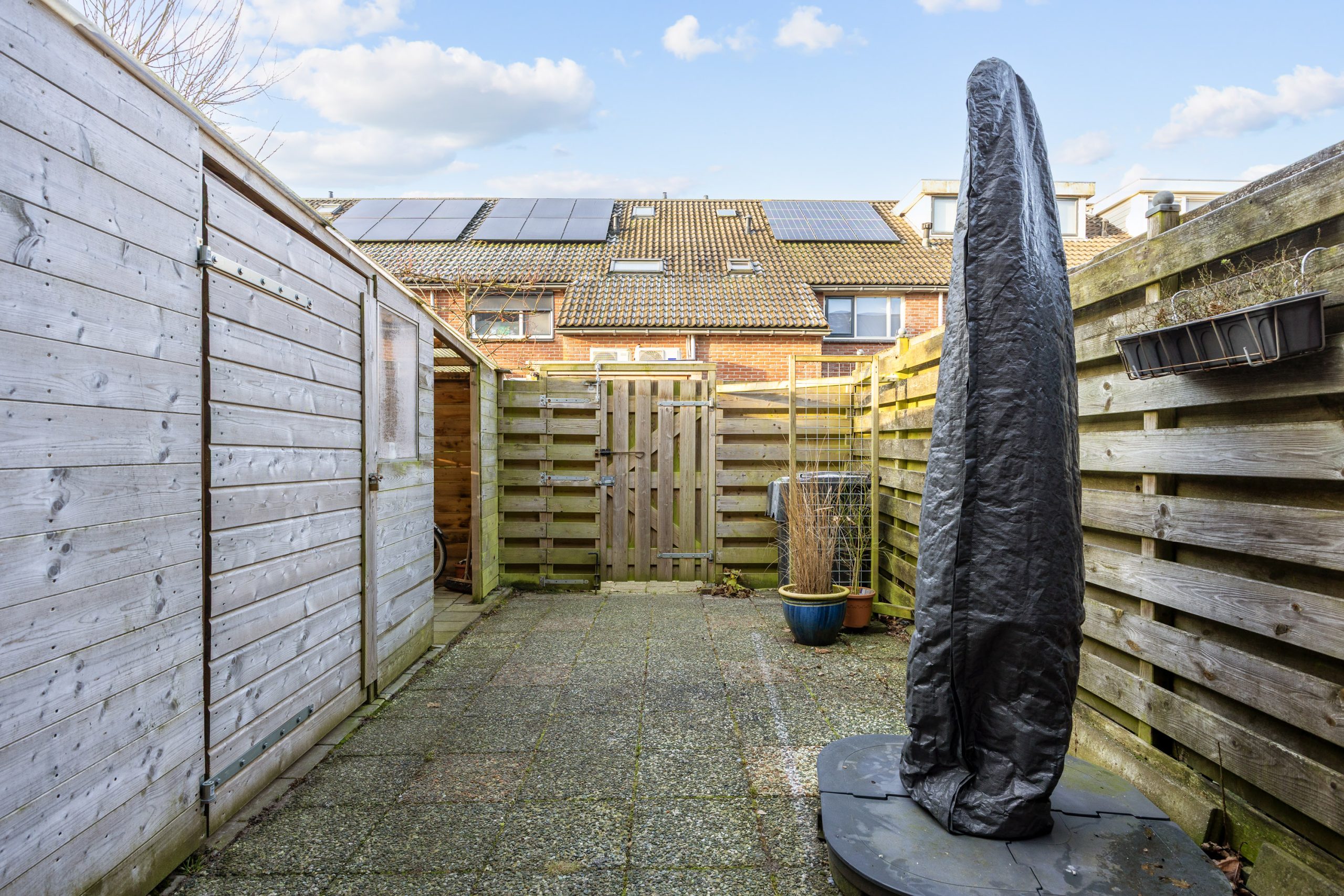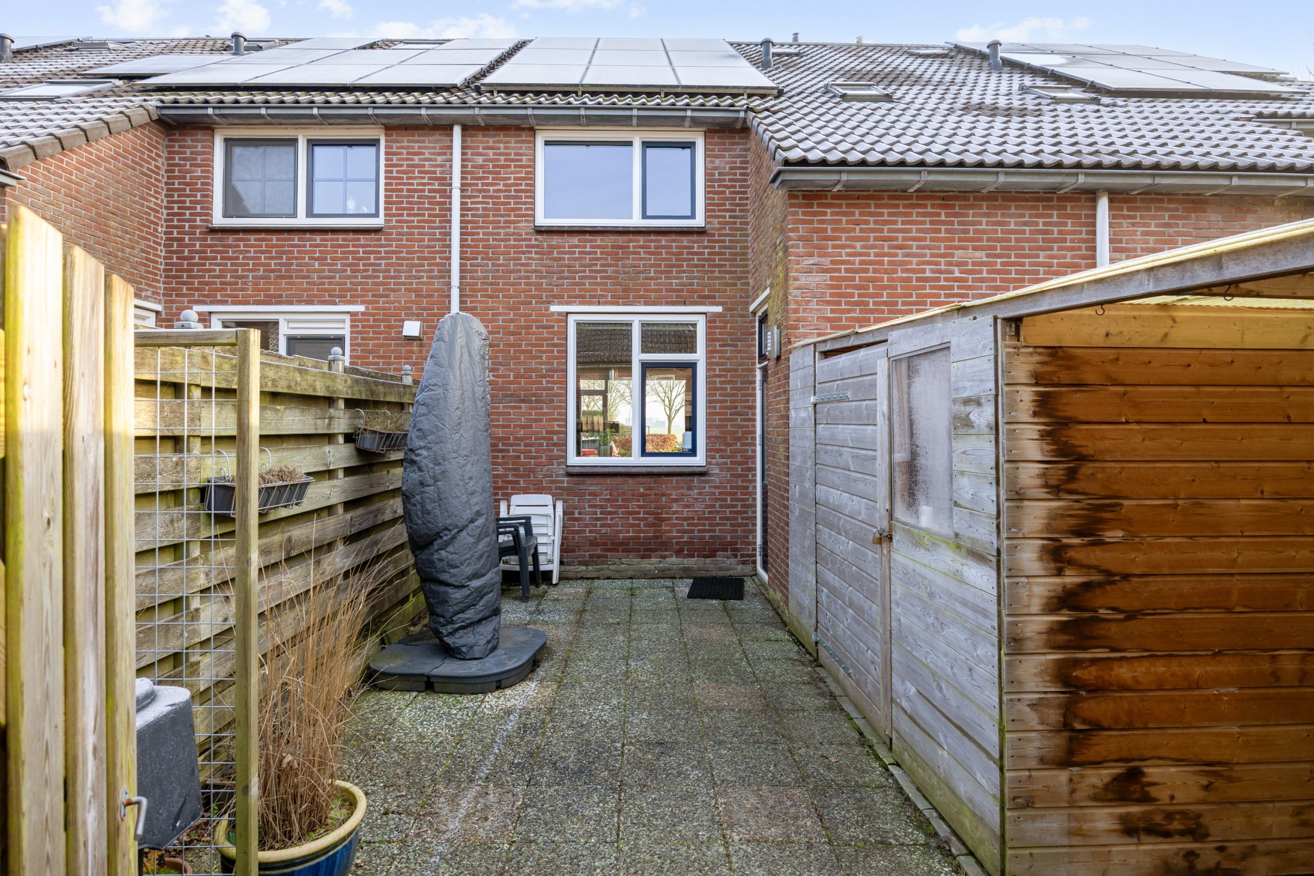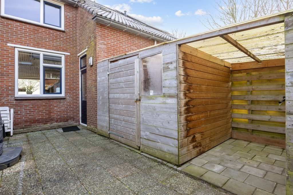 De tuin is gesitueerd op het zonnige westen en biedt veel privacy. Hier sluit je in de zomer de dag af met een glas wijn om te genieten van de avondzon, die hier lang aanwezig is. Ook vind je er een praktische houten berging/ schuur met kleine overkapping.
