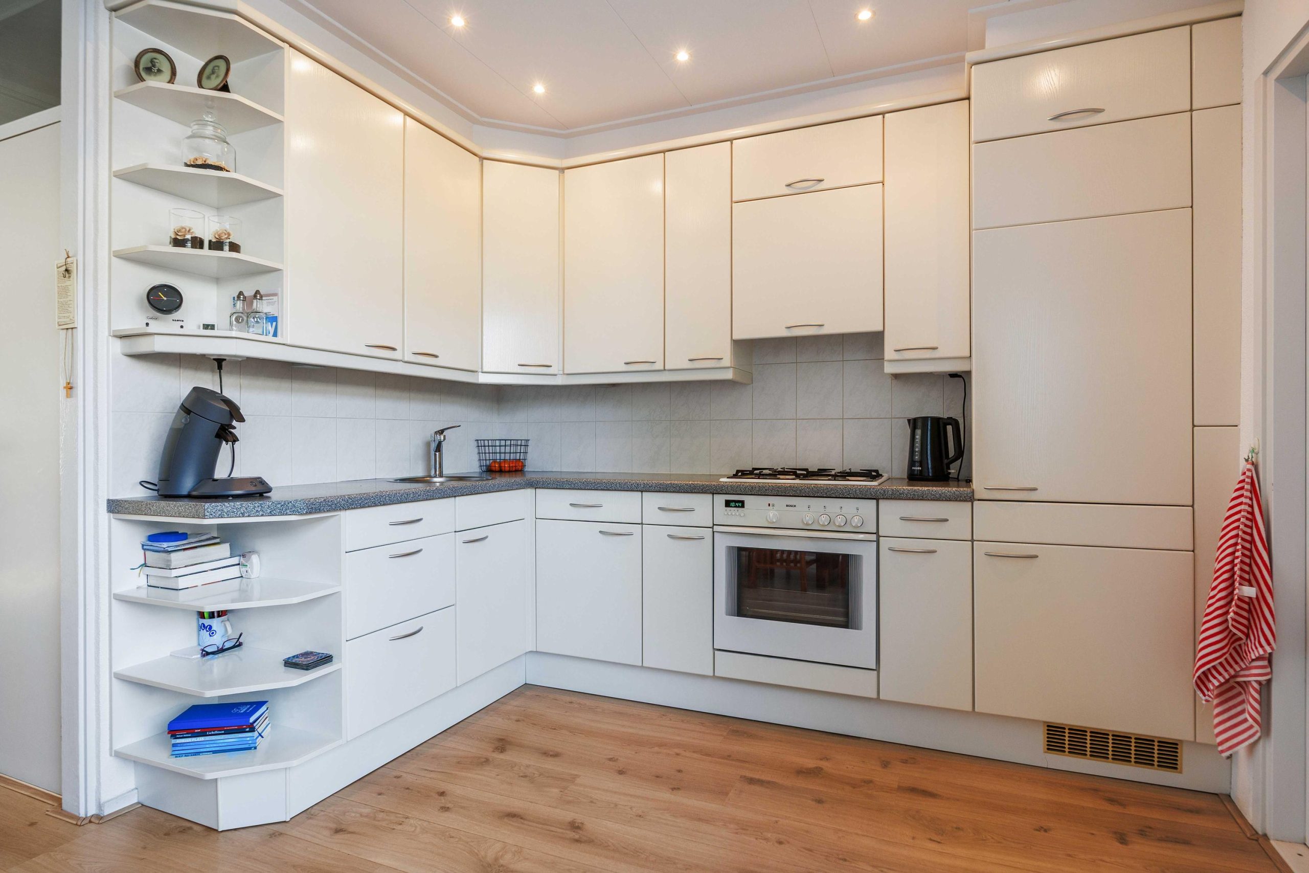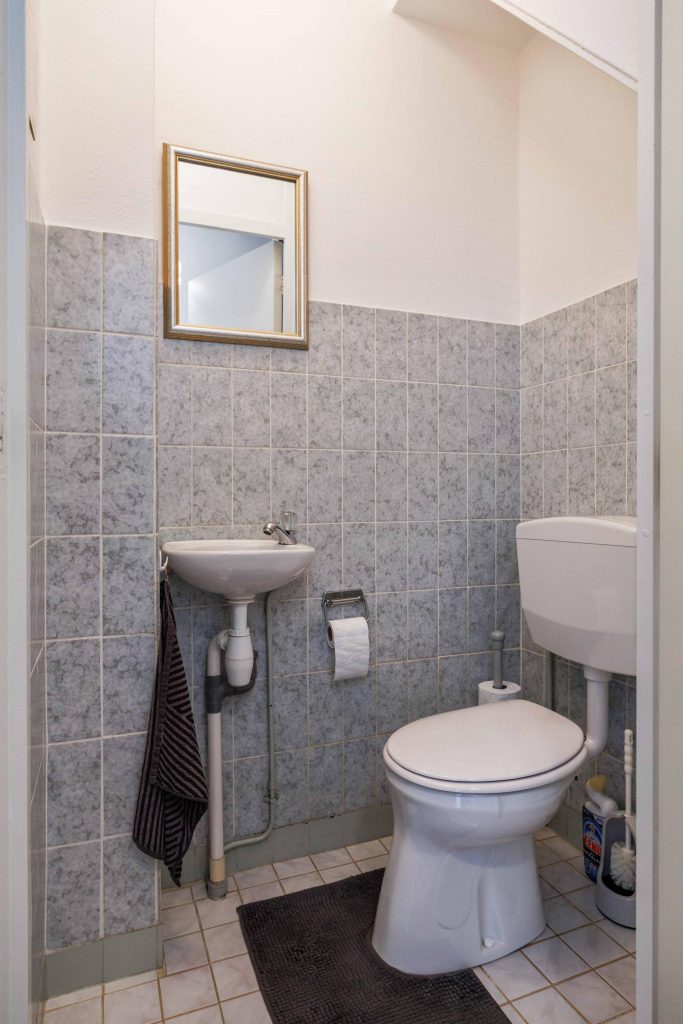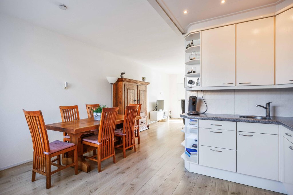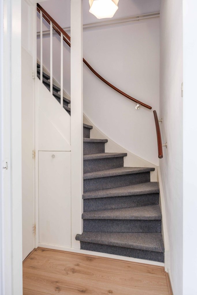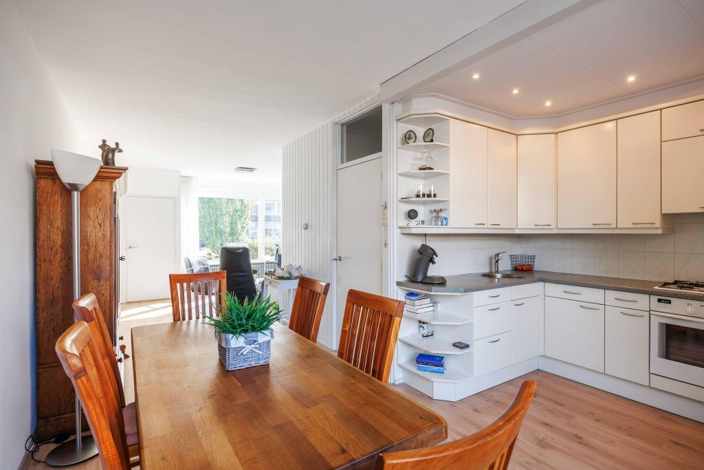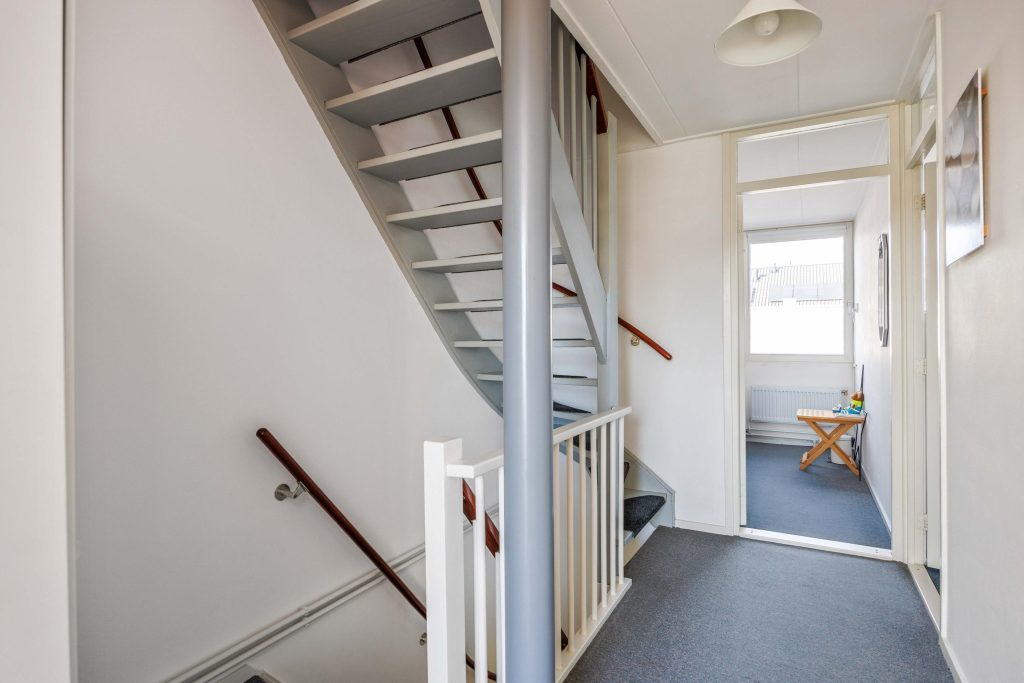 Begane grond: Vanuit de entree/hal met meterkast, kom je in de L-vormige woonkamer van ca. 31m². De woonkamer kenmerkt zich door het prettige lichtinval en heeft zicht over gemeente groen en de straat. De halfopen keuken is gesitueerd aan de tuinzijde en heeft een nette keukeninrichting voorzien van inbouwapparatuur zoals een 4-pits gasstel, afzuigkap, oven en een koel-/vriescombinatie (2025). Aansluitend aan de keuken kom je in de compacte bijkeuken met witgoedaansluiting, cv-ketel, omvormer en deur naar de tuin. Centraal in de woning tref je de tussenhal met keurig toilet en trapopgang.