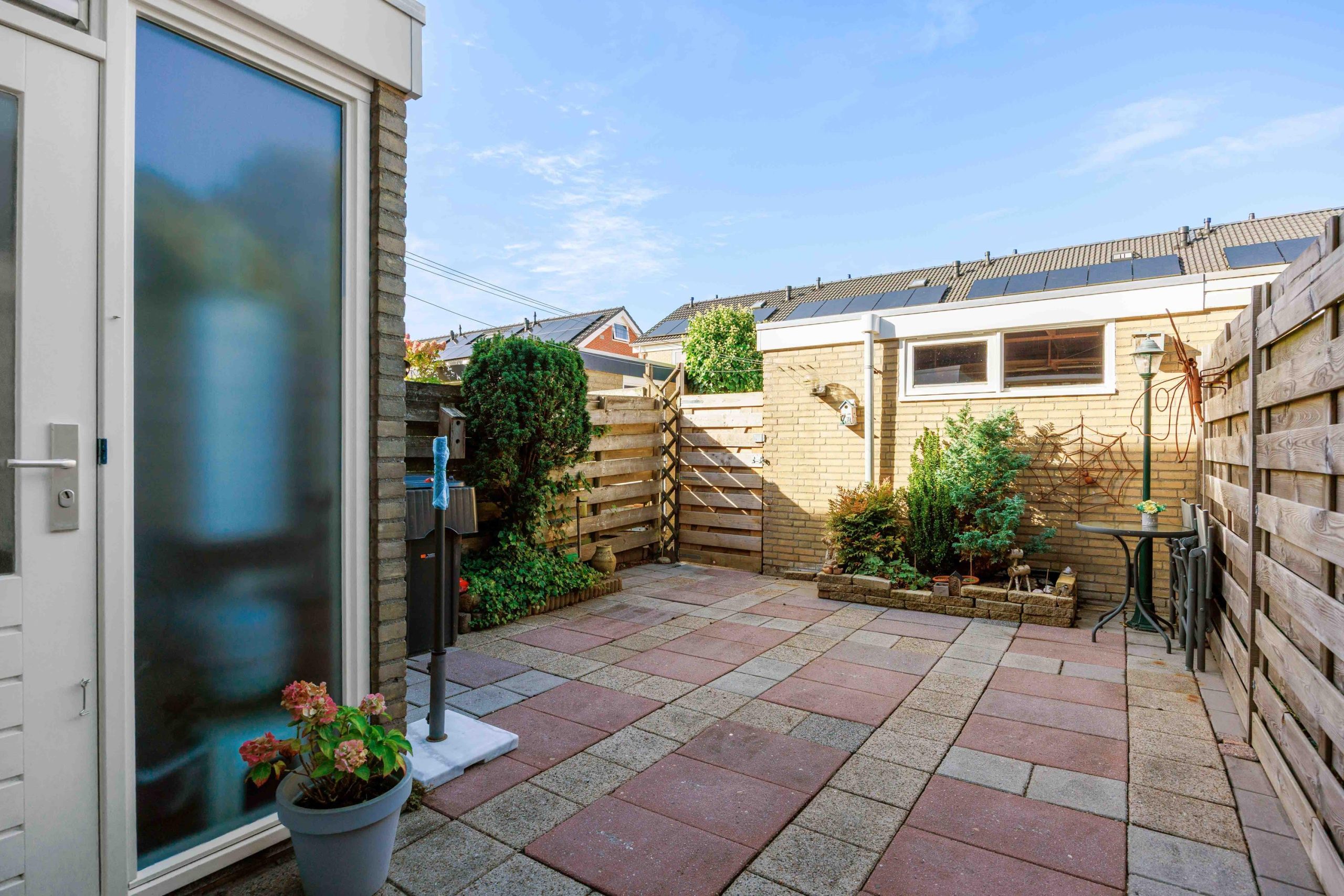 De onderhoudsarme tuin is gesitueerd op het zonnige westen, bestaat voornamelijk uit terras en borders en beschikt over een stenen fietsenberging en een achterom. De tuin kenmerkt zich door een besloten ligging en veel privacy.