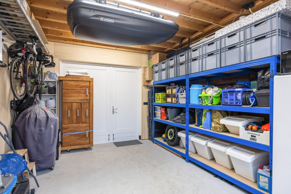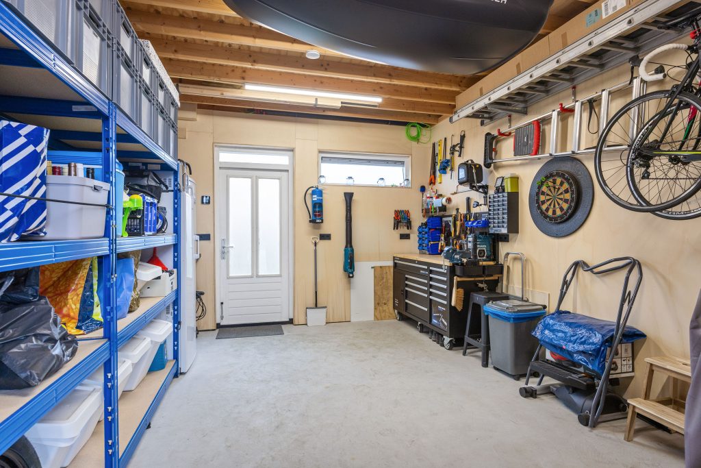 In 2023 aangebouwde, volledig geïsoleerde, houten garage van ca. 20m² met electra- en de mogelijkheid voor een water aansluiting, openslaande deuren naar de ruime oprit en een loopdeur naar de tuin.