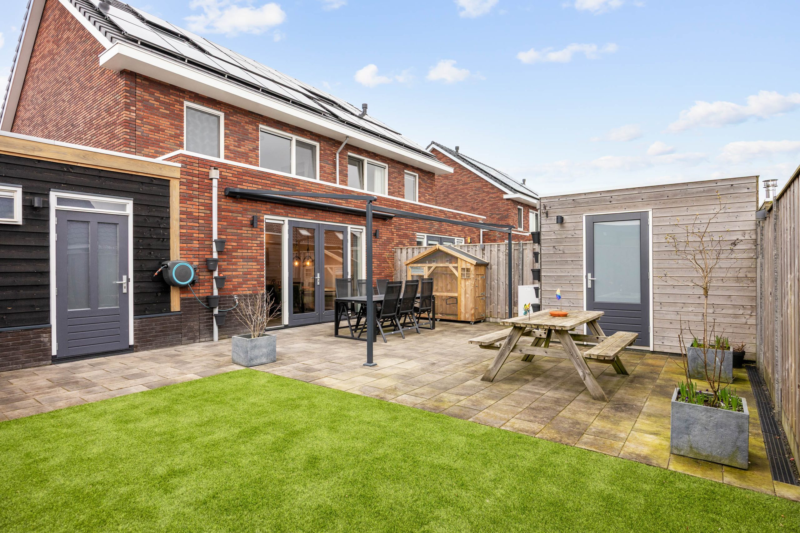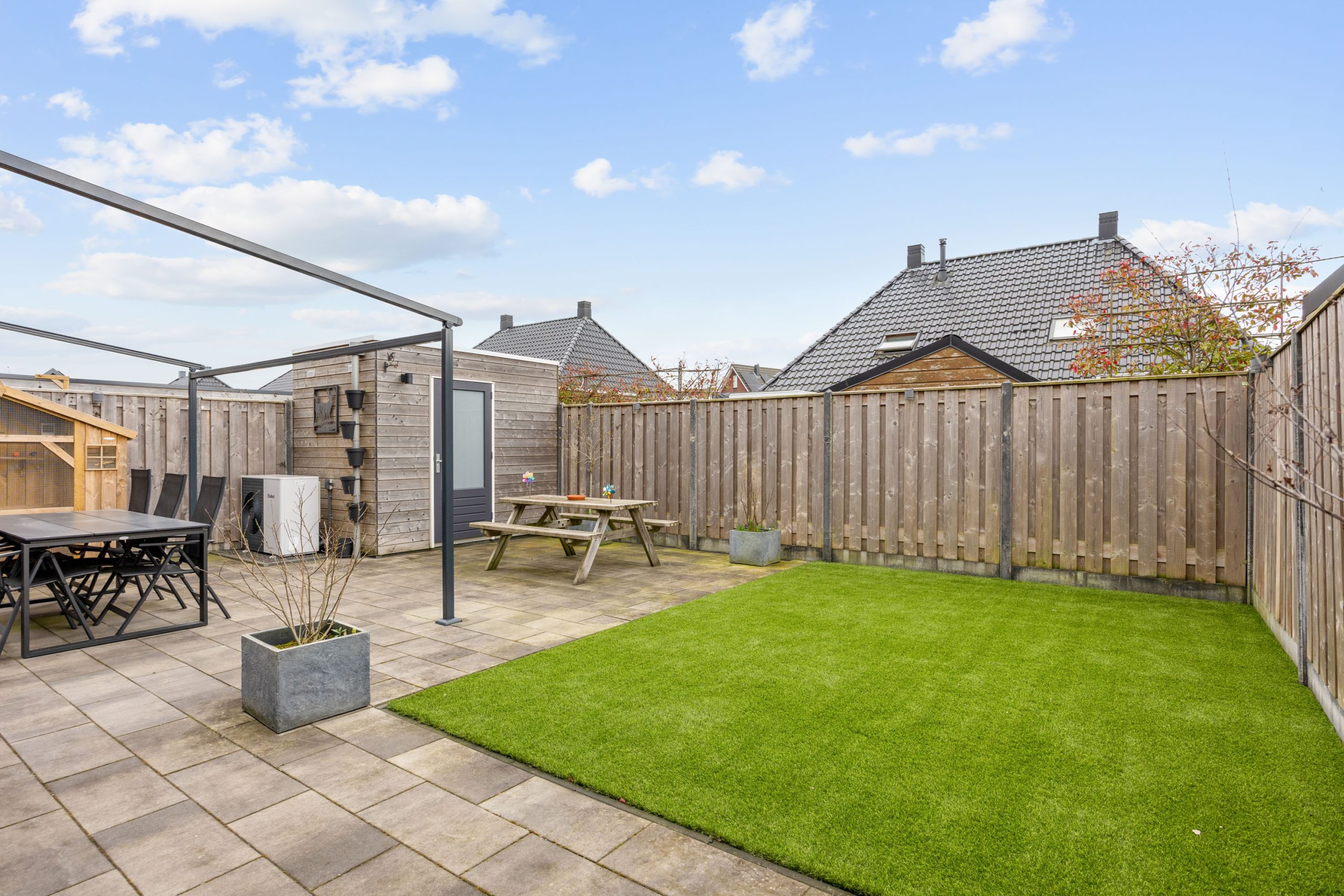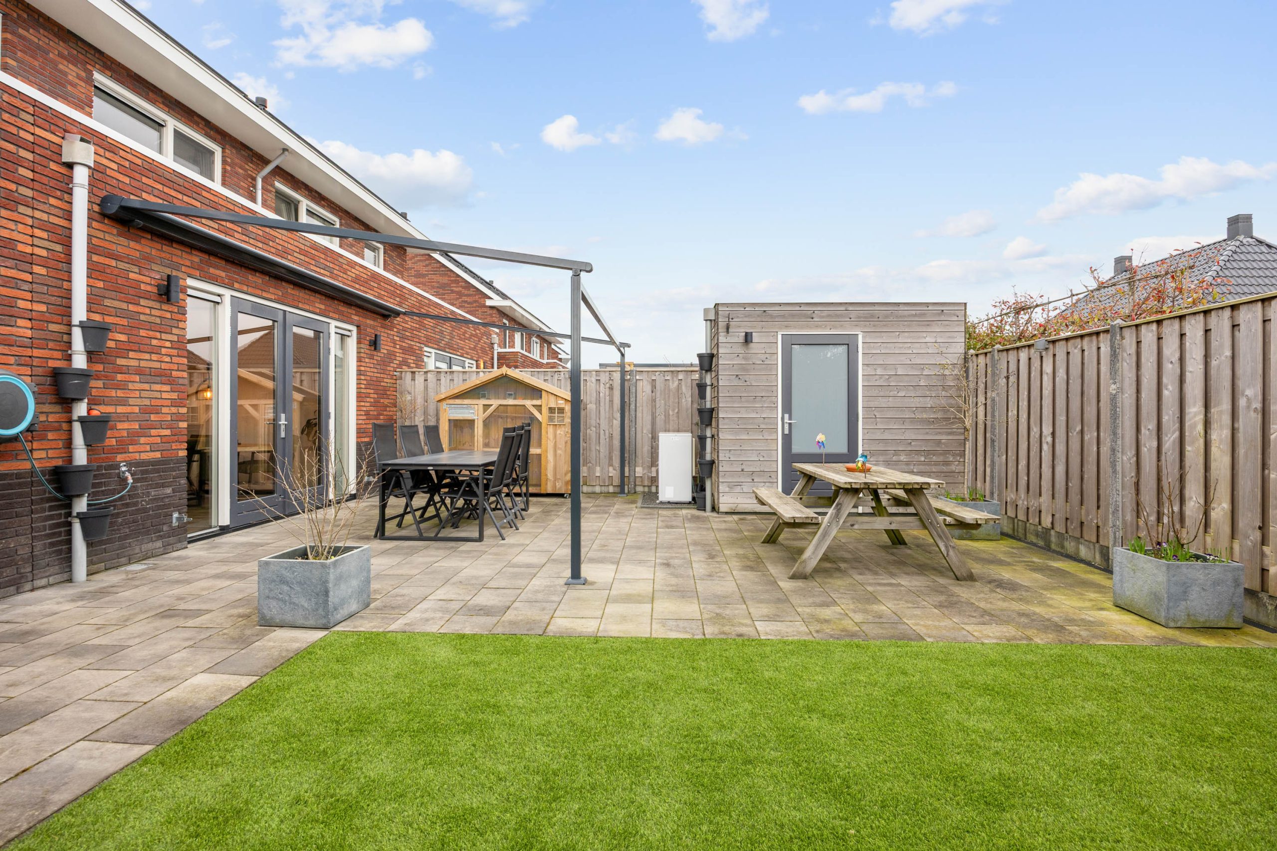 De zonnige, besloten tuin met veel privacy is gesitueerd op het zonnige zuidoosten en bestaat voornamelijk uit gazon (kunstgras) en terras. Daarnaast beschikt de tuin over een zonnescherm/ terrasoverkapping aan de woning en een extra vrijstaande tuin-/ fietsenberging van ca. 6m².