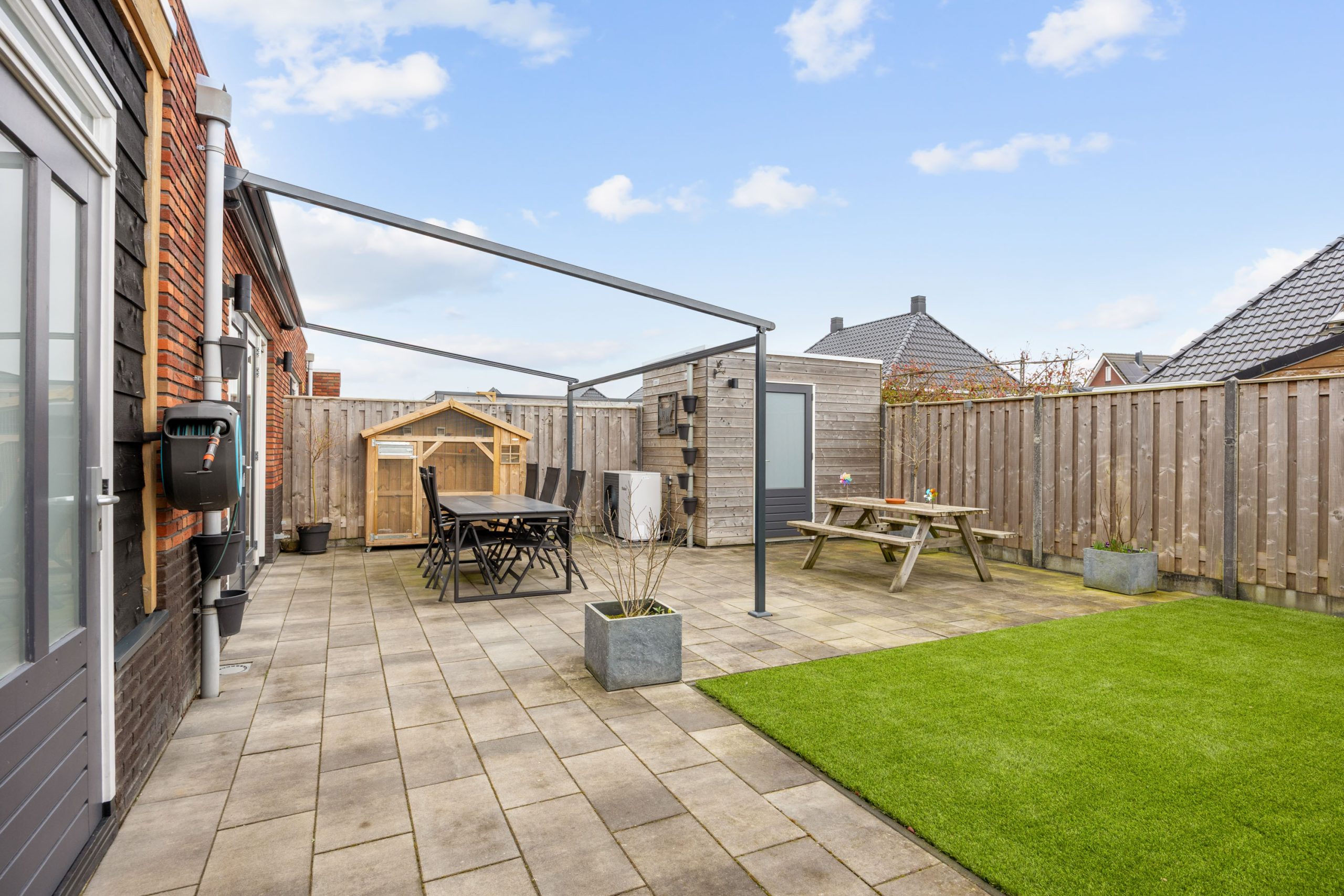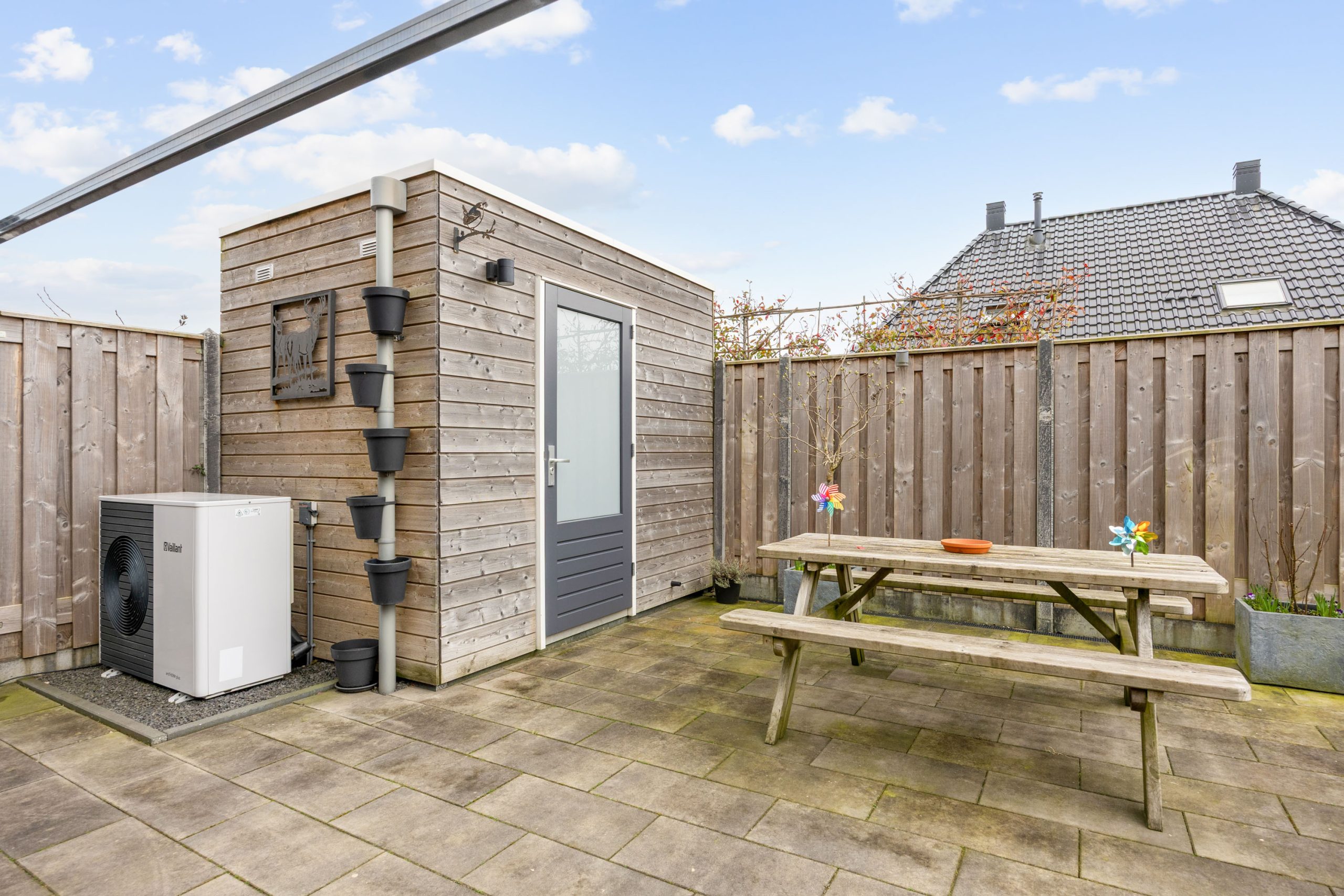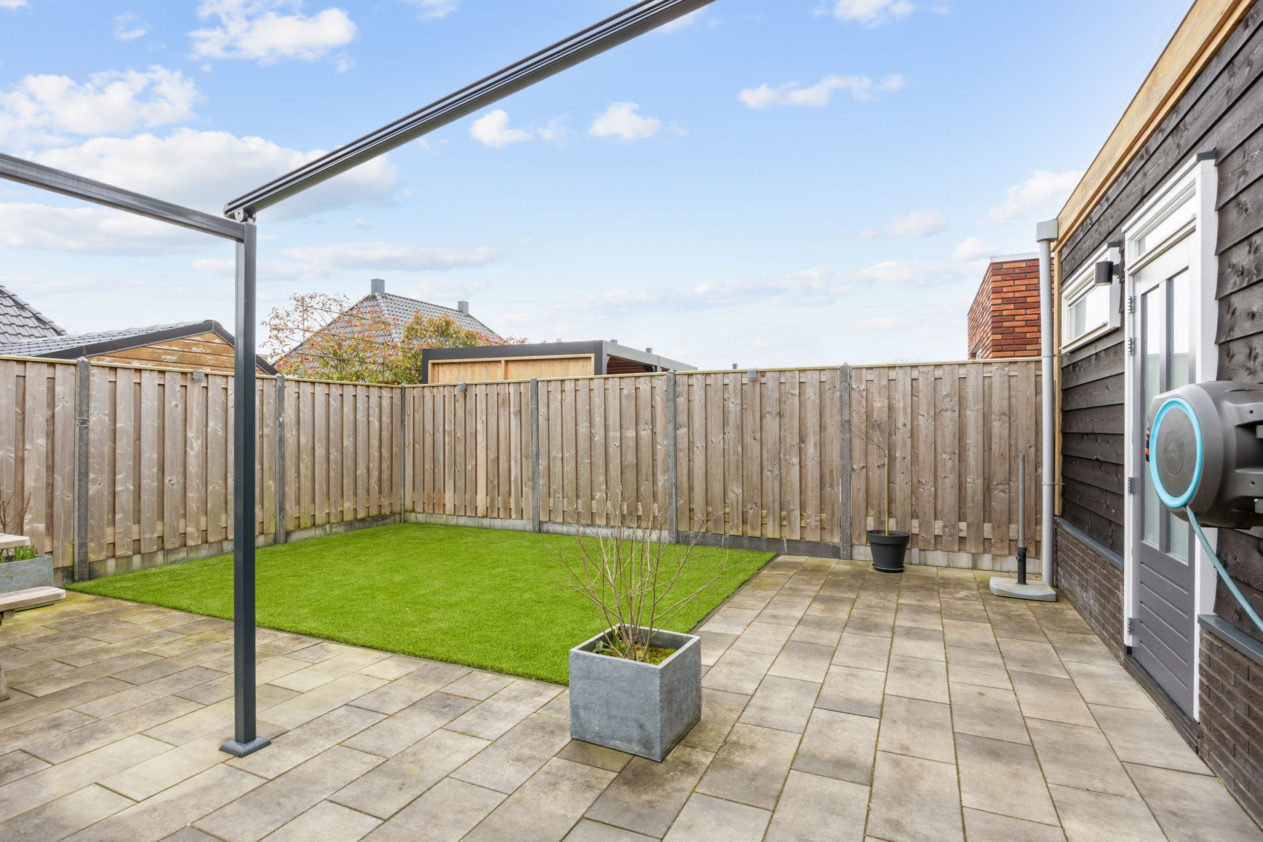 De zonnige, besloten tuin met veel privacy is gesitueerd op het zonnige zuidoosten en bestaat voornamelijk uit gazon (kunstgras) en terras. Daarnaast beschikt de tuin over een zonnescherm/ terrasoverkapping aan de woning en een extra vrijstaande tuin-/ fietsenberging van ca. 6m².