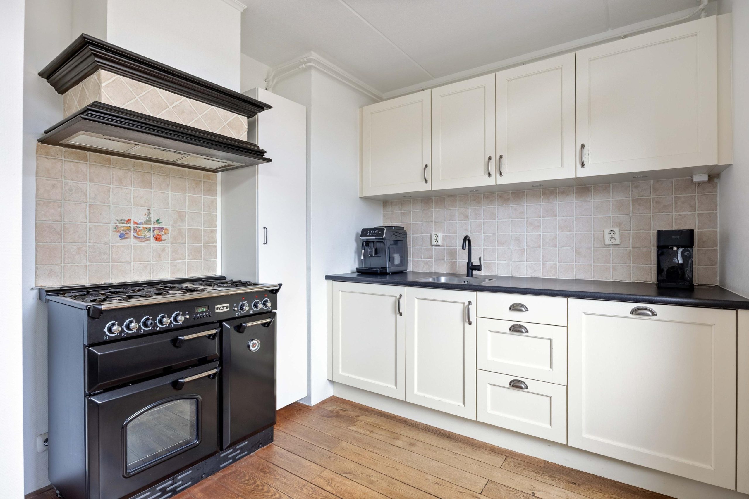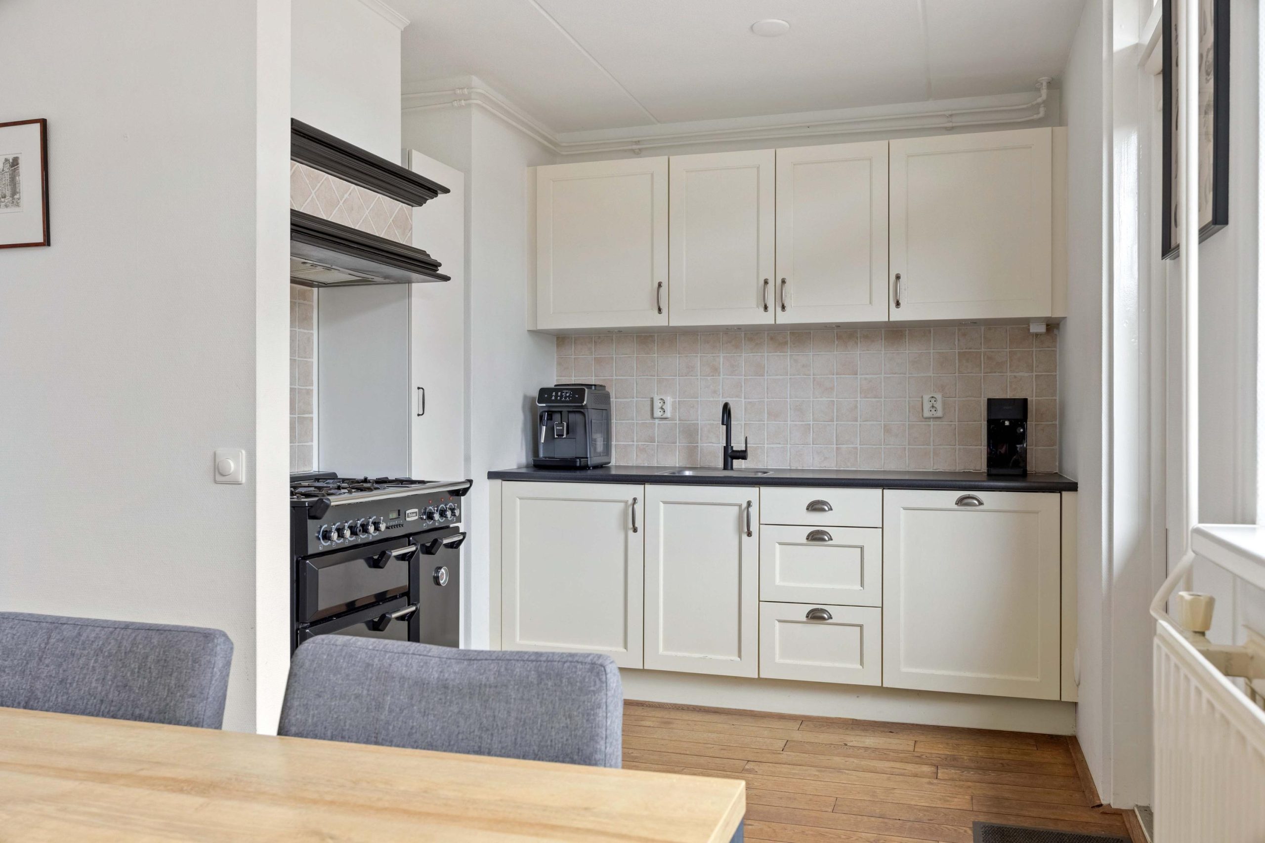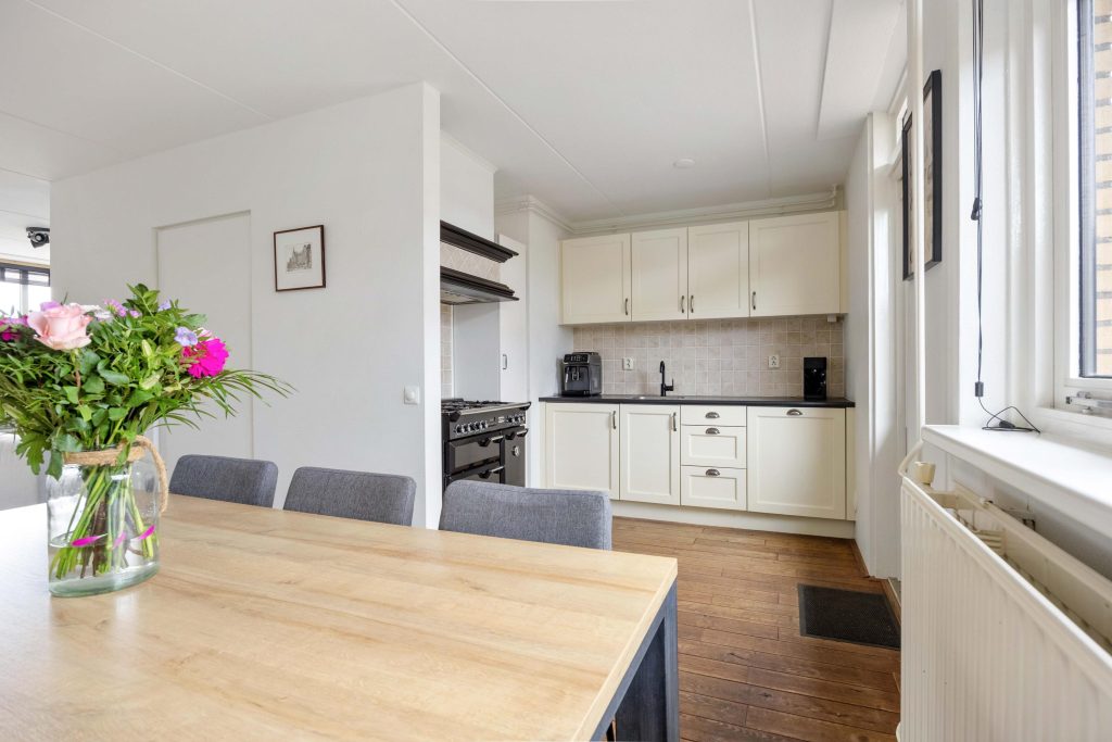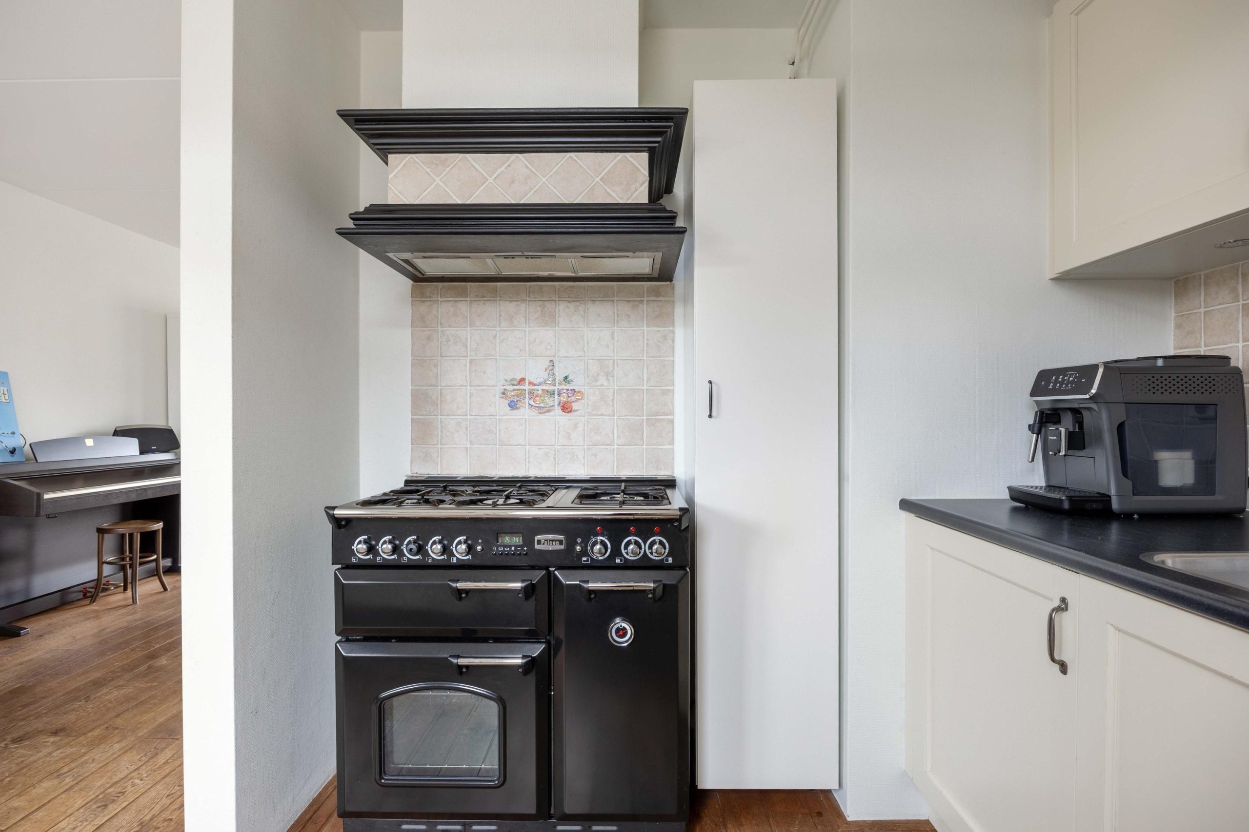 Vanuit de zij-entree met meterkast en toilet, kom je in de sfeervolle, lichte woonkamer van ruim 31m² met een fijne zithoek. Aan de tuinzijde tref je vervolgens de open keuken van ruim 6m² met veel licht, deur naar de tuin en een keukeninrichting in hoekopstelling voorzien van 5-pits Falcon gasstel met dubbele oven, afzuigkap, koelkast en vaatwasser.