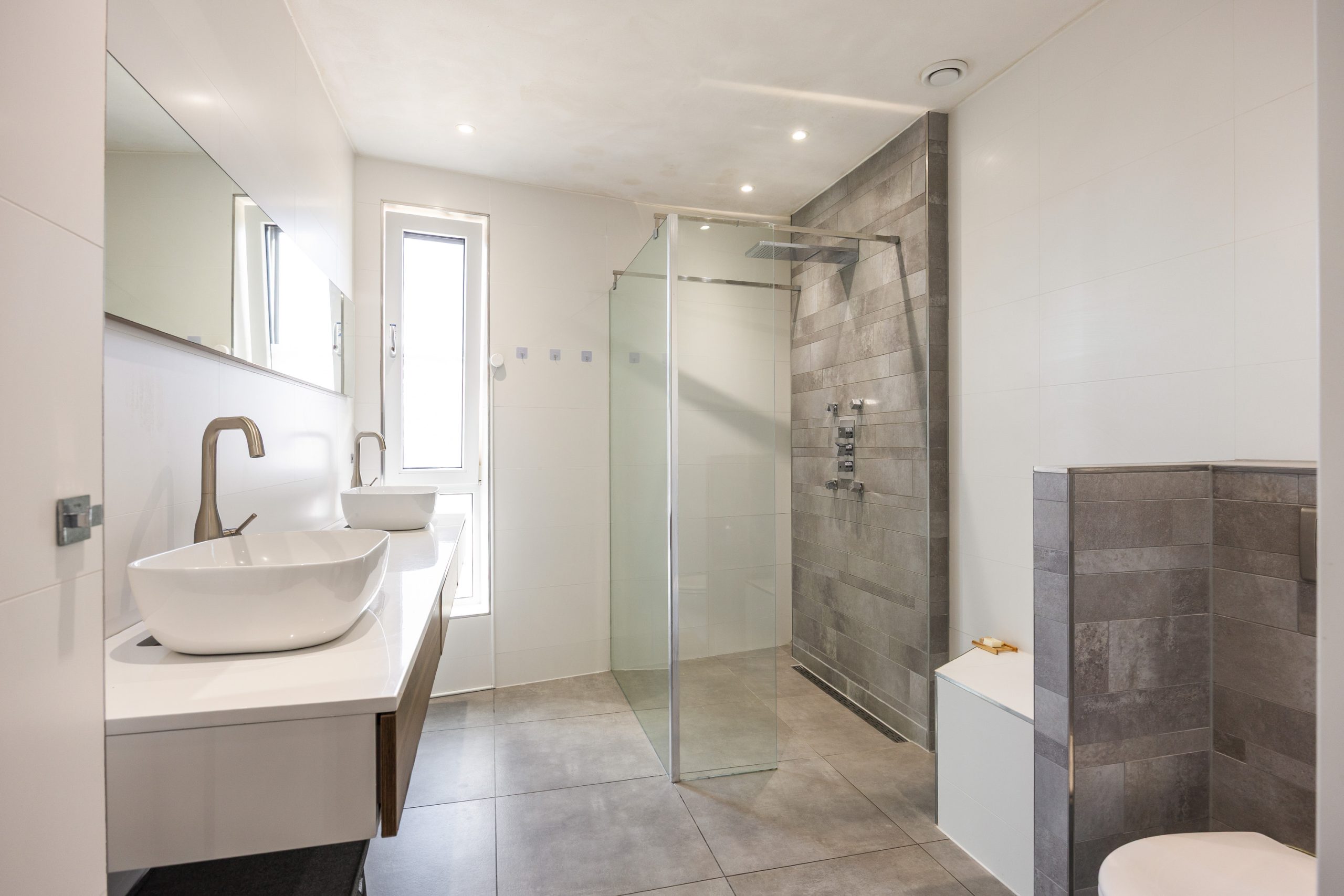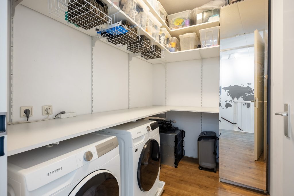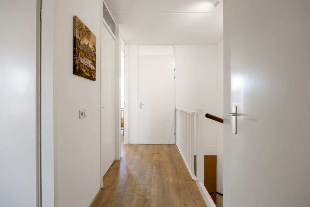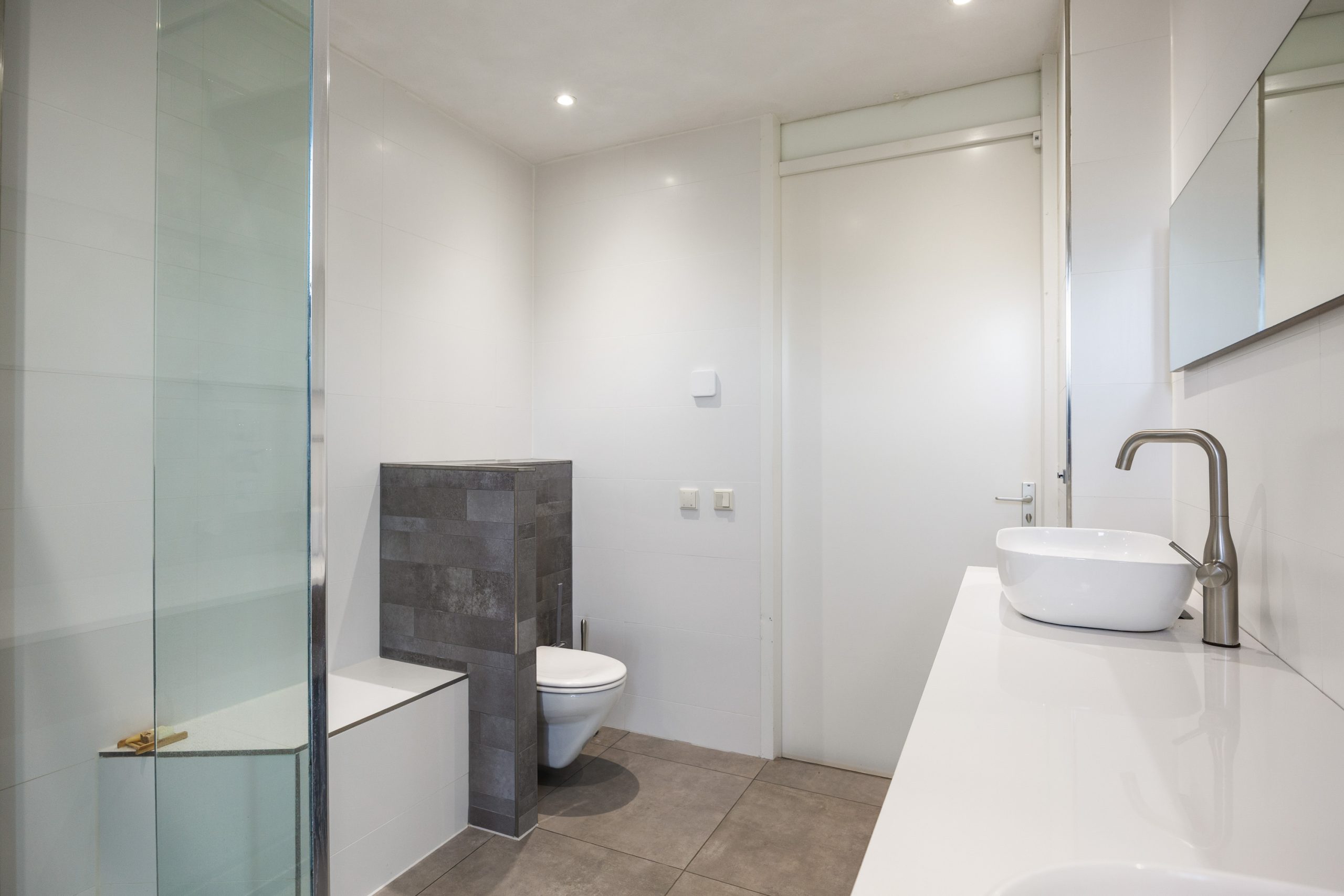 Vanaf de overloop is er toegang tot de badkamer, de praktische witgoedruimte en de 3 prima slaapkamers van resp. ca. 9,5, 10 en 13,5m². De moderne badkamer is voorzien van een royale inloopdouche, 2e toilet en een dubbelwastafelmeubel. Bovendien is ook de gehele 1e verdieping, inclusief de badkamer, voorzien van vloerverwarming.