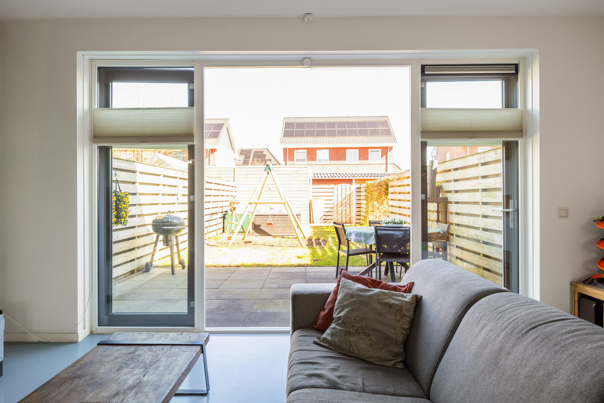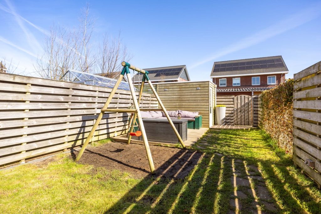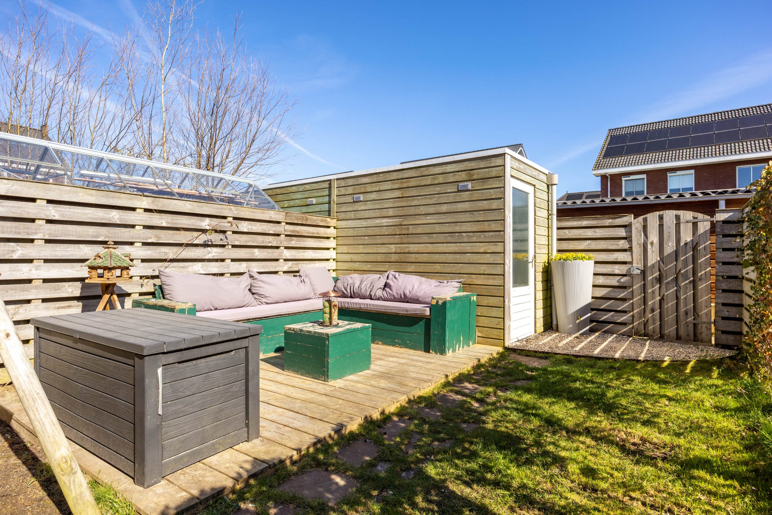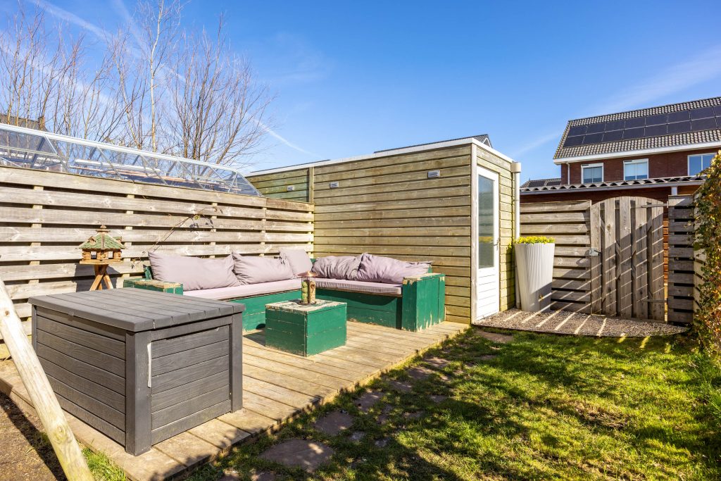 De zonnige, besloten tuin met veel privacy is gesitueerd op het oosten en bestaat voornamelijk uit gazon en terras. Mede door de diepte van de tuin kun je de gehele dag genieten van zon, maar zijn er ook altijd plekken met voldoende schaduw. Daarnaast beschikt de tuin over een extra vrijstaande tuin-/ fietsenberging van ca. 6m².