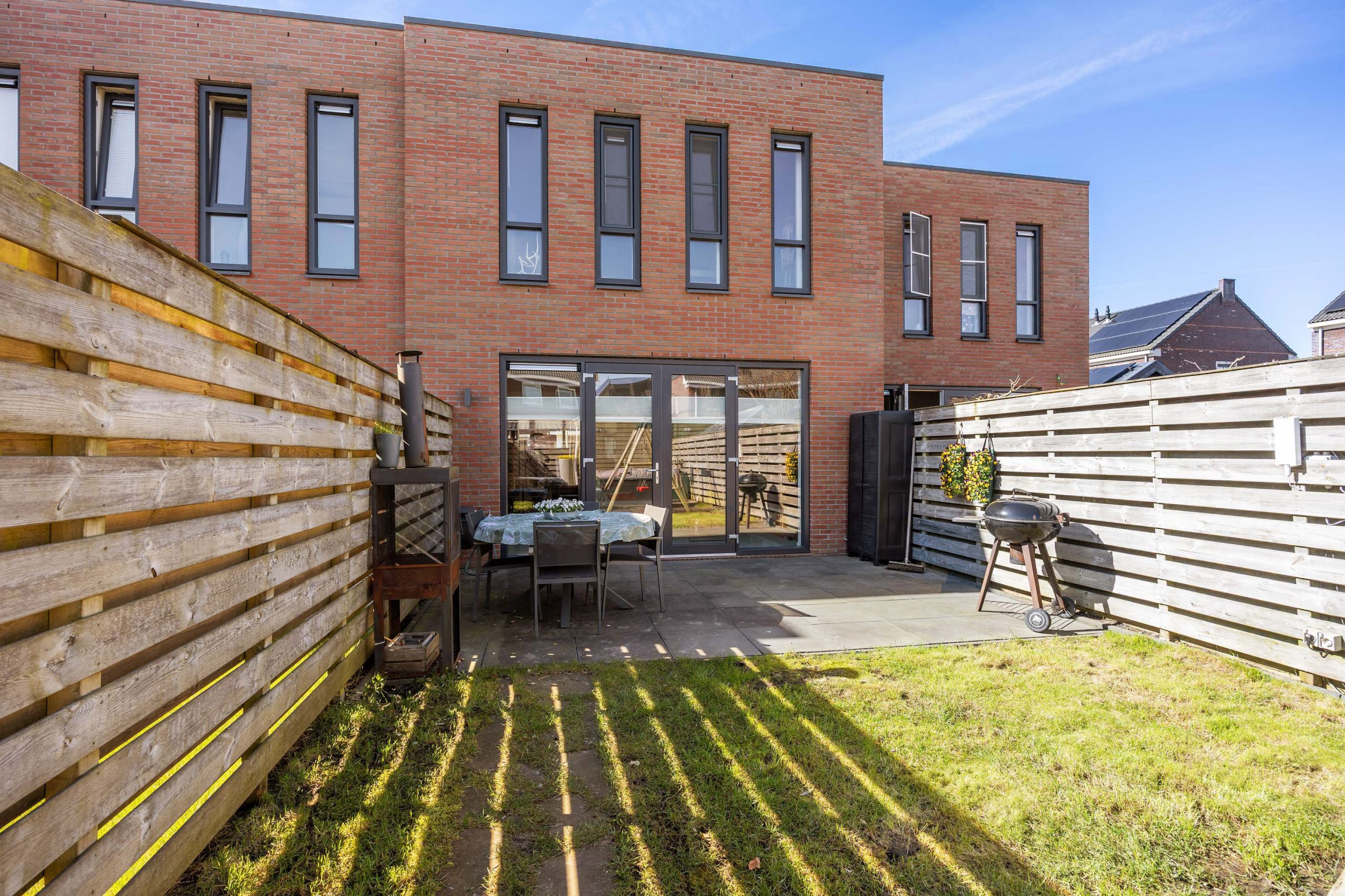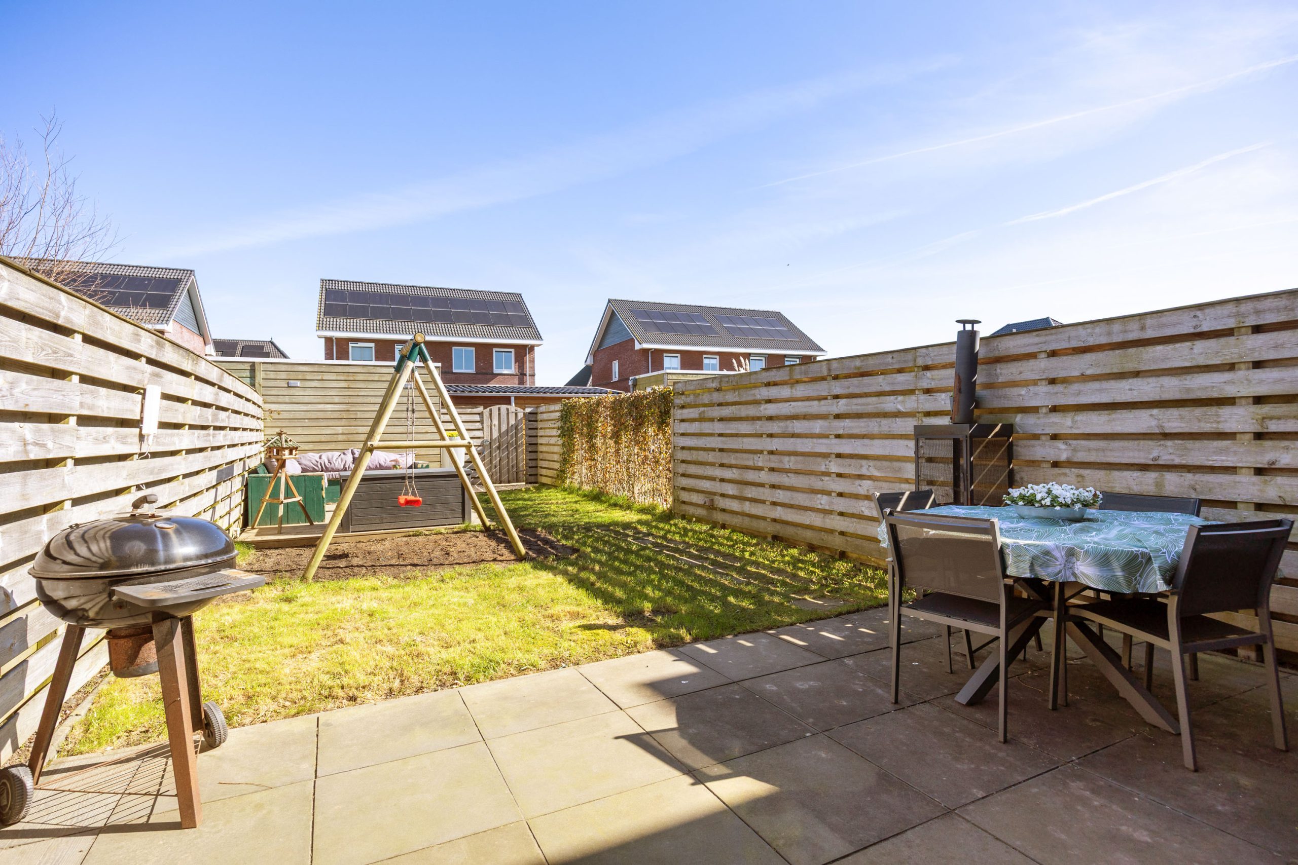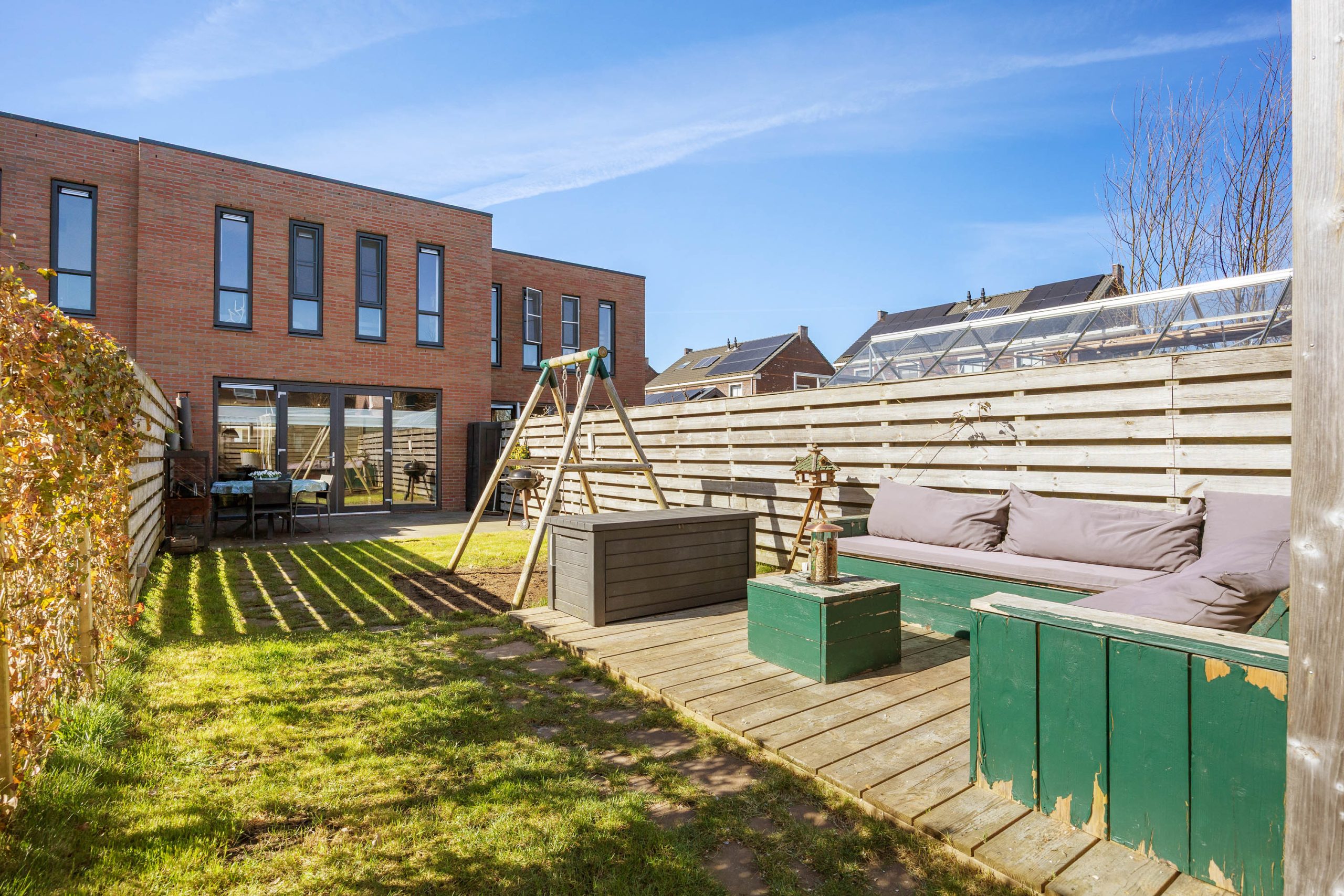 De zonnige, besloten tuin met veel privacy is gesitueerd op het oosten en bestaat voornamelijk uit gazon en terras. Mede door de diepte van de tuin kun je de gehele dag genieten van zon, maar zijn er ook altijd plekken met voldoende schaduw. Daarnaast beschikt de tuin over een extra vrijstaande tuin-/ fietsenberging van ca. 6m².