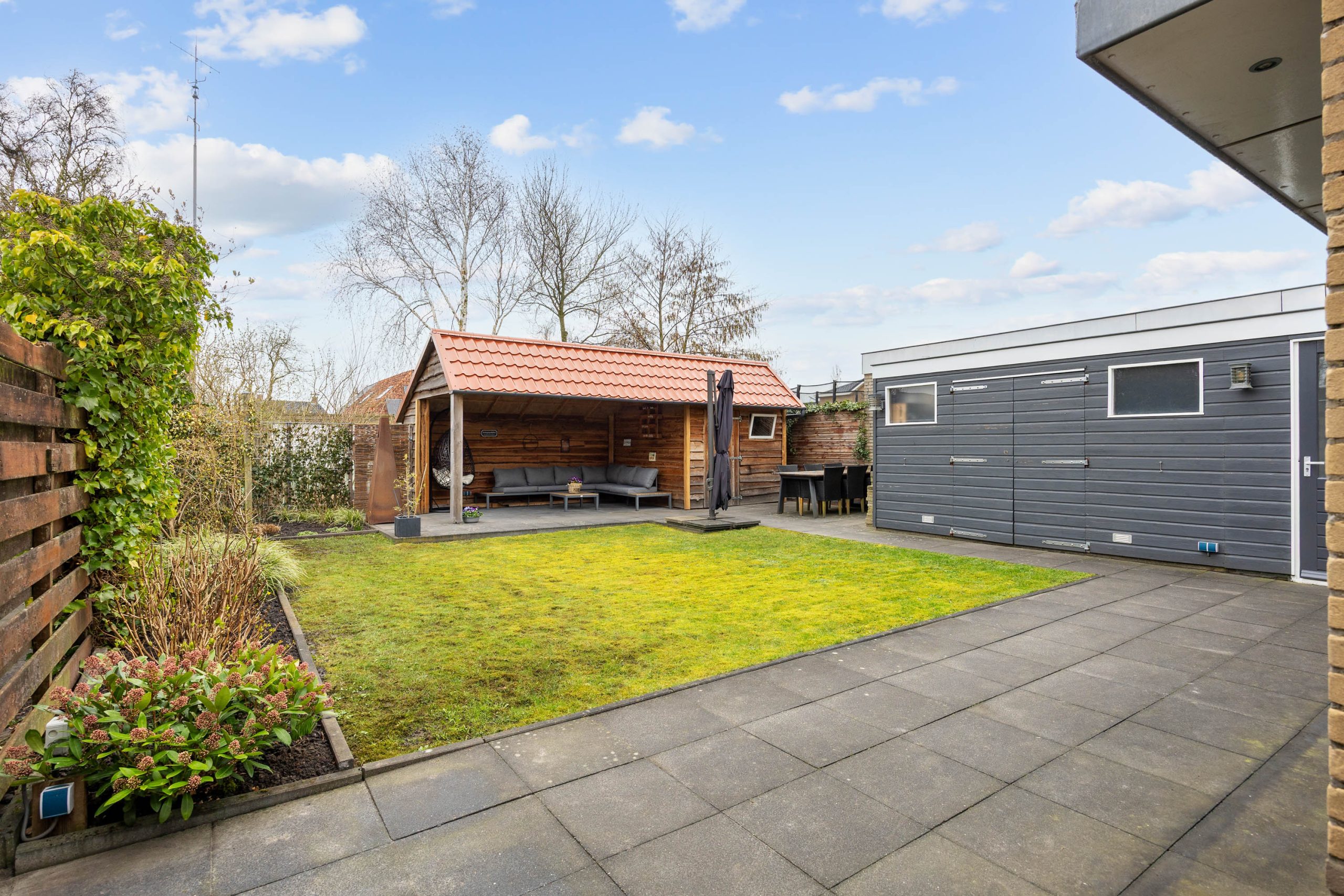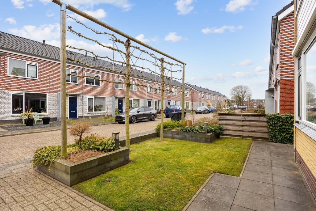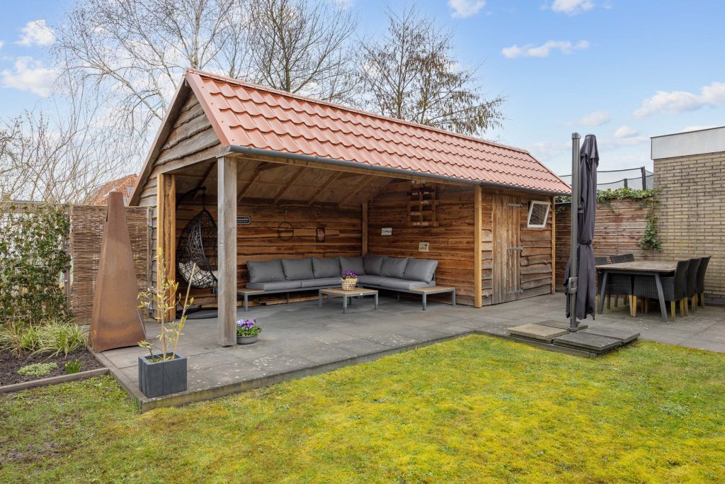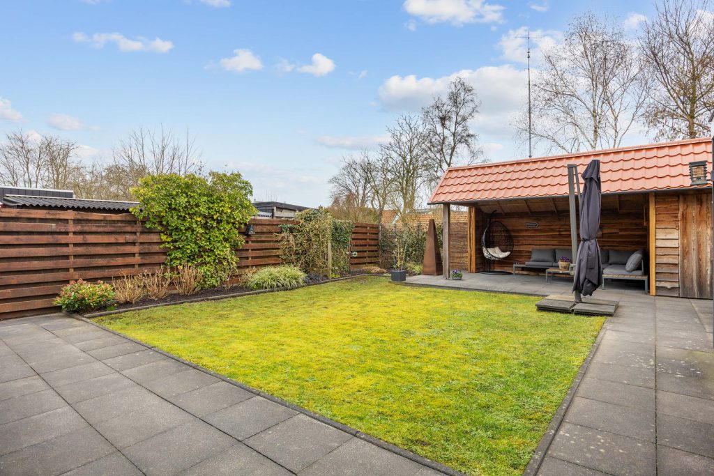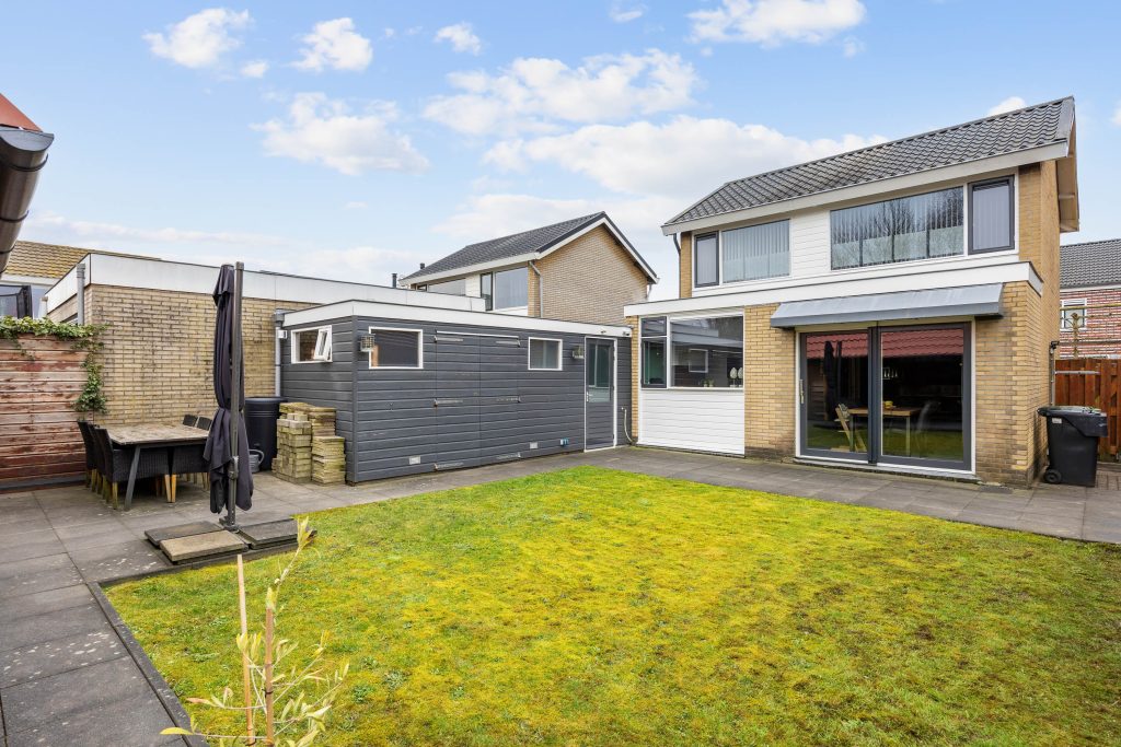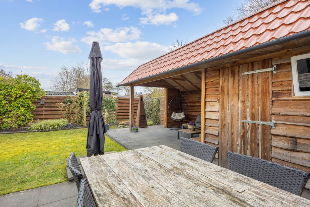 Je vindt veel privacy en beschutting in de, op het noorden gelegen, maar toch zonnige achtertuin. De ruime tuin heeft een achterom en bestaat grotendeels uit terras, gras en borders. De houten tuinberging is ideaal voor het stallen van de fietsen en/- of tuinmeubilair en de sfeervolle veranda/ terrasoverkapping met berging maken het geheel compleet.