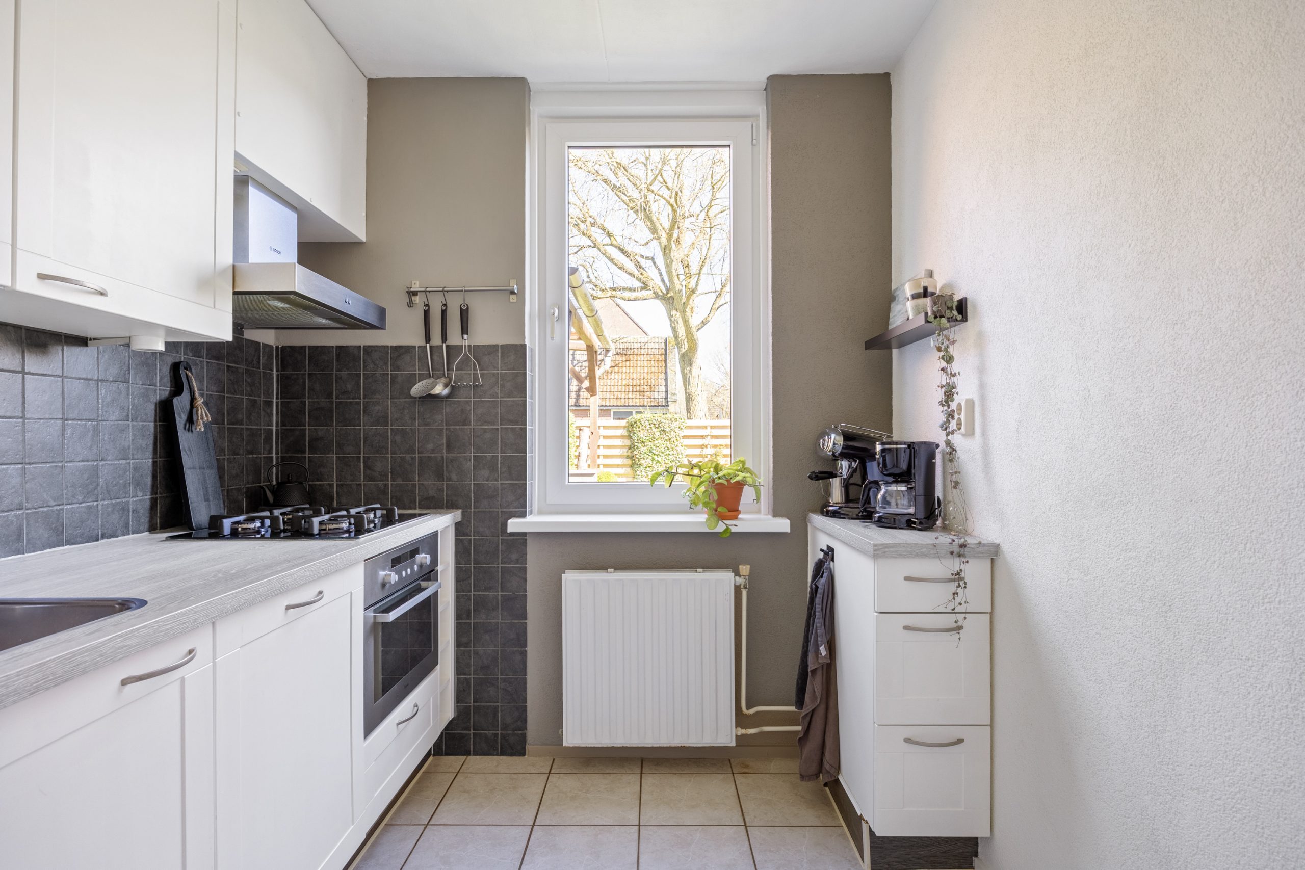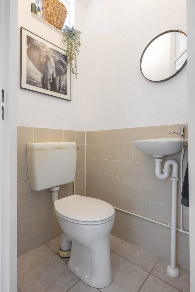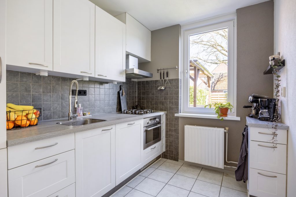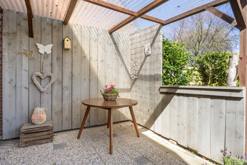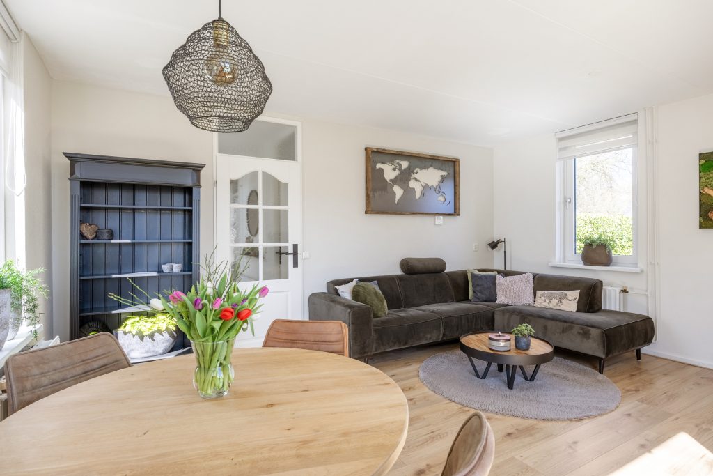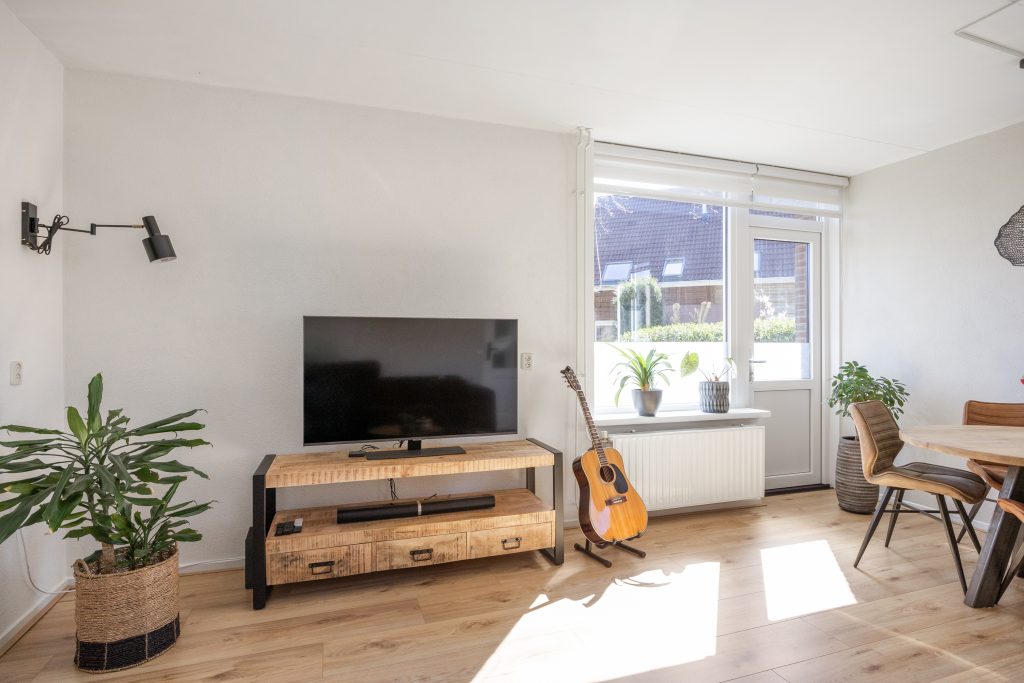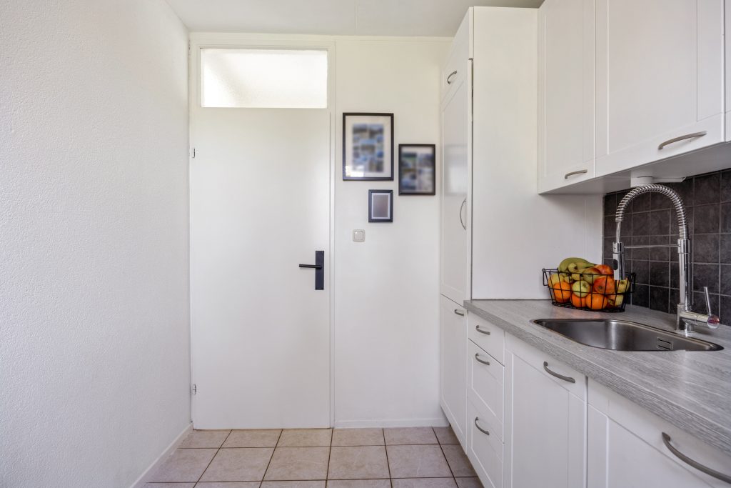 Vanuit de entree met meterkast en toilet, heb je toegang tot de bijkeuken, moderne keuken met combi-oven, vaatwasser en koel/vries combinatie. Aan het einde van de hal vind je de lichte en knusse leefruimte van respectievelijk 22m², die je middels een deur toegang geeft naar het terras aan de zijkant van de woning, gelegen op het zonnige zuidoosten.