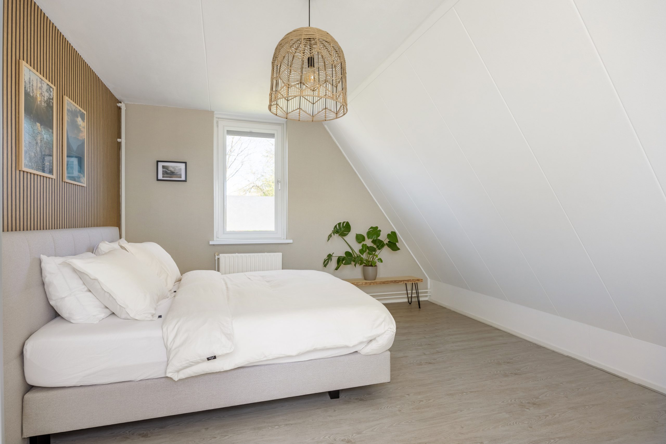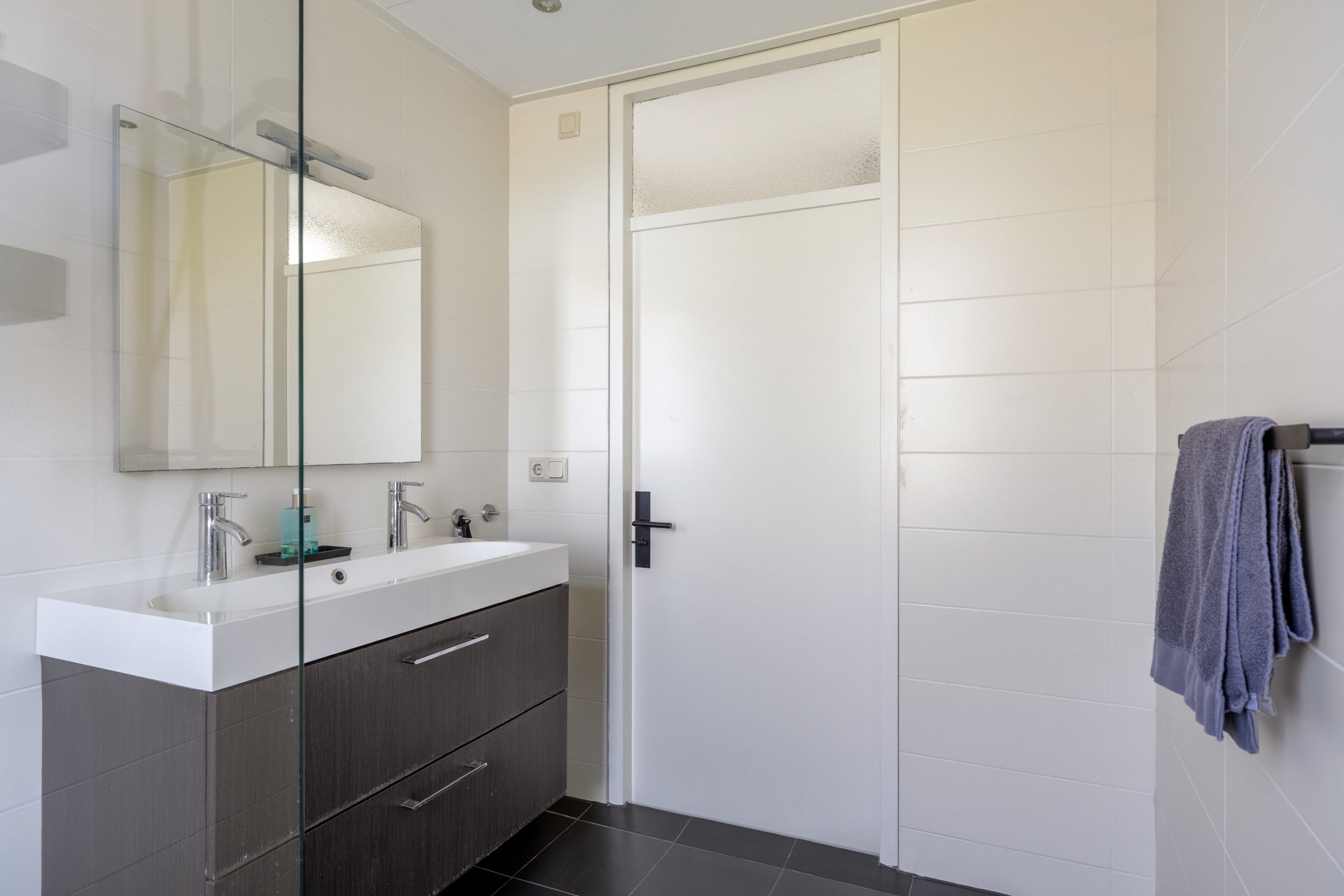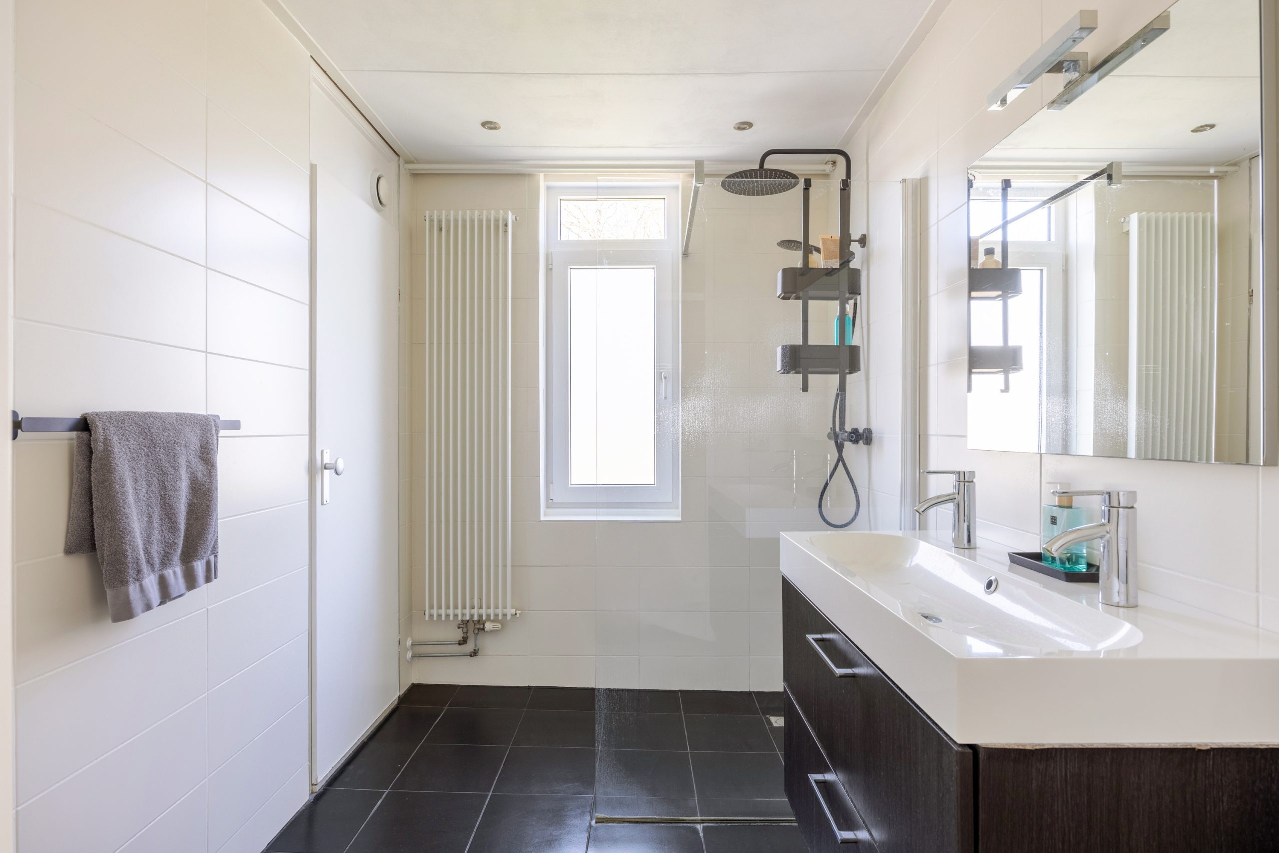 Vanaf de overloop is er toegang tot de badkamer en de 2 ruime slaapkamers van resp. ca. 11,5 en 16,5m². De moderne badkamer is voorzien van een ruime inloopdouche, mechanische ventilatie en een dubbel wastafelmeubel. Tevens vind je in de badkamer, achter een gesloten deur, de hybride CV-ketel uit 2024 en ruimte voor je witgoed.