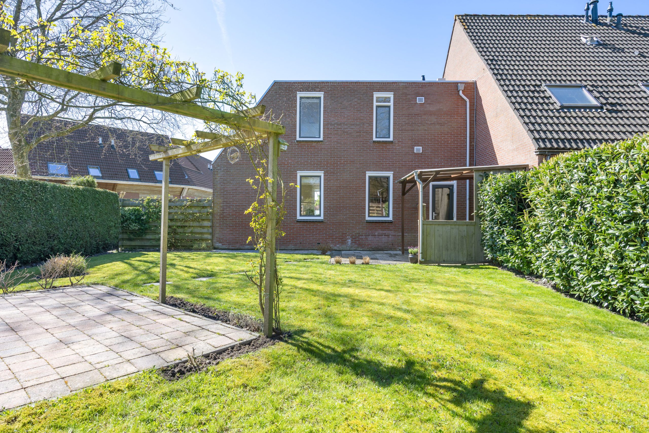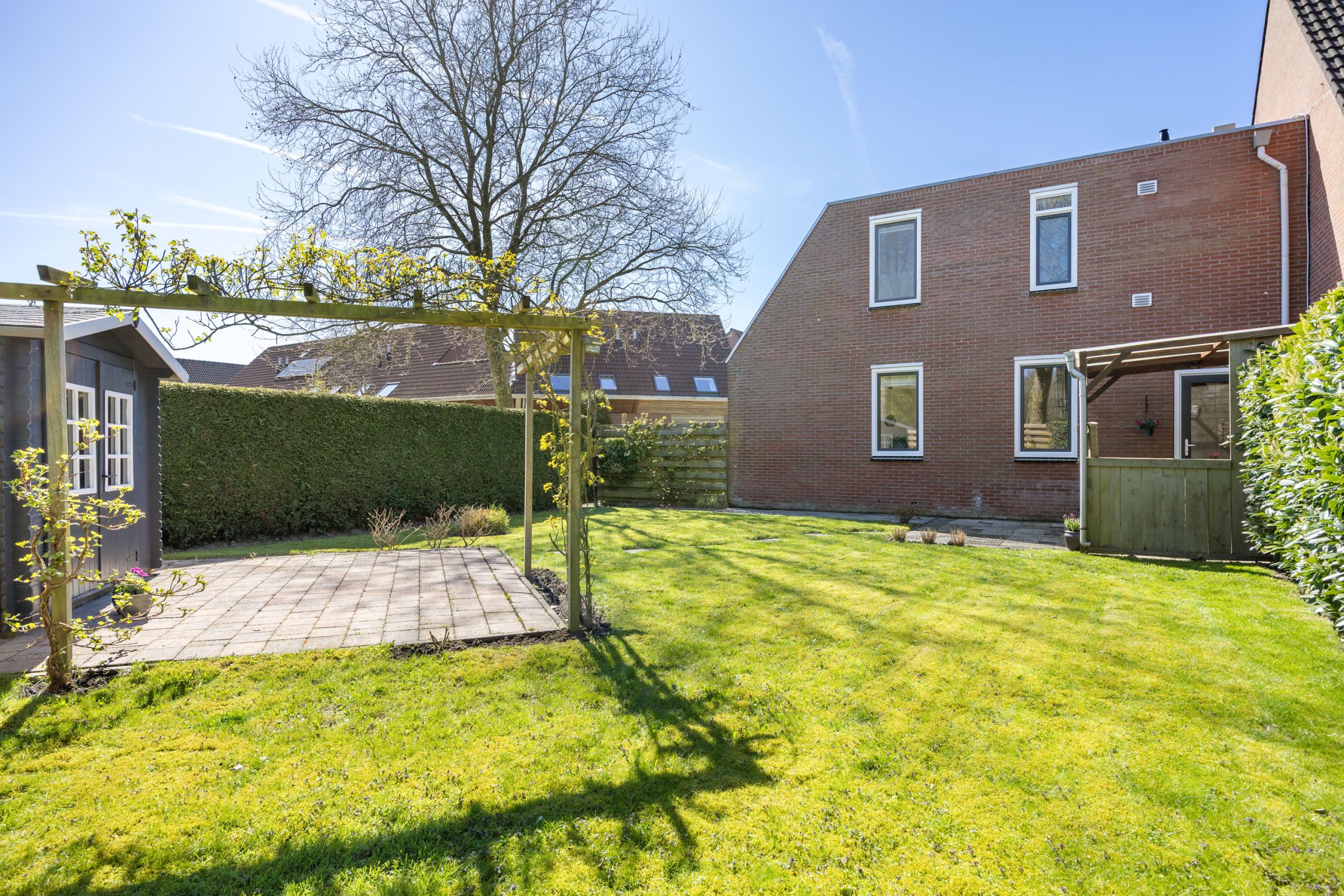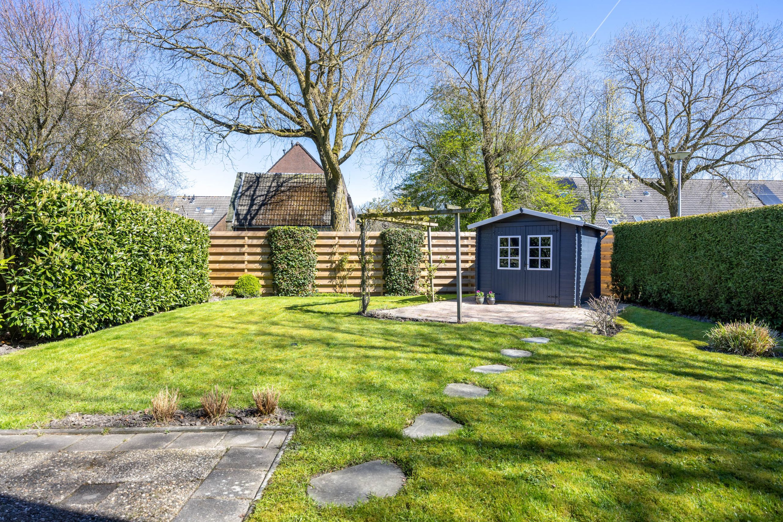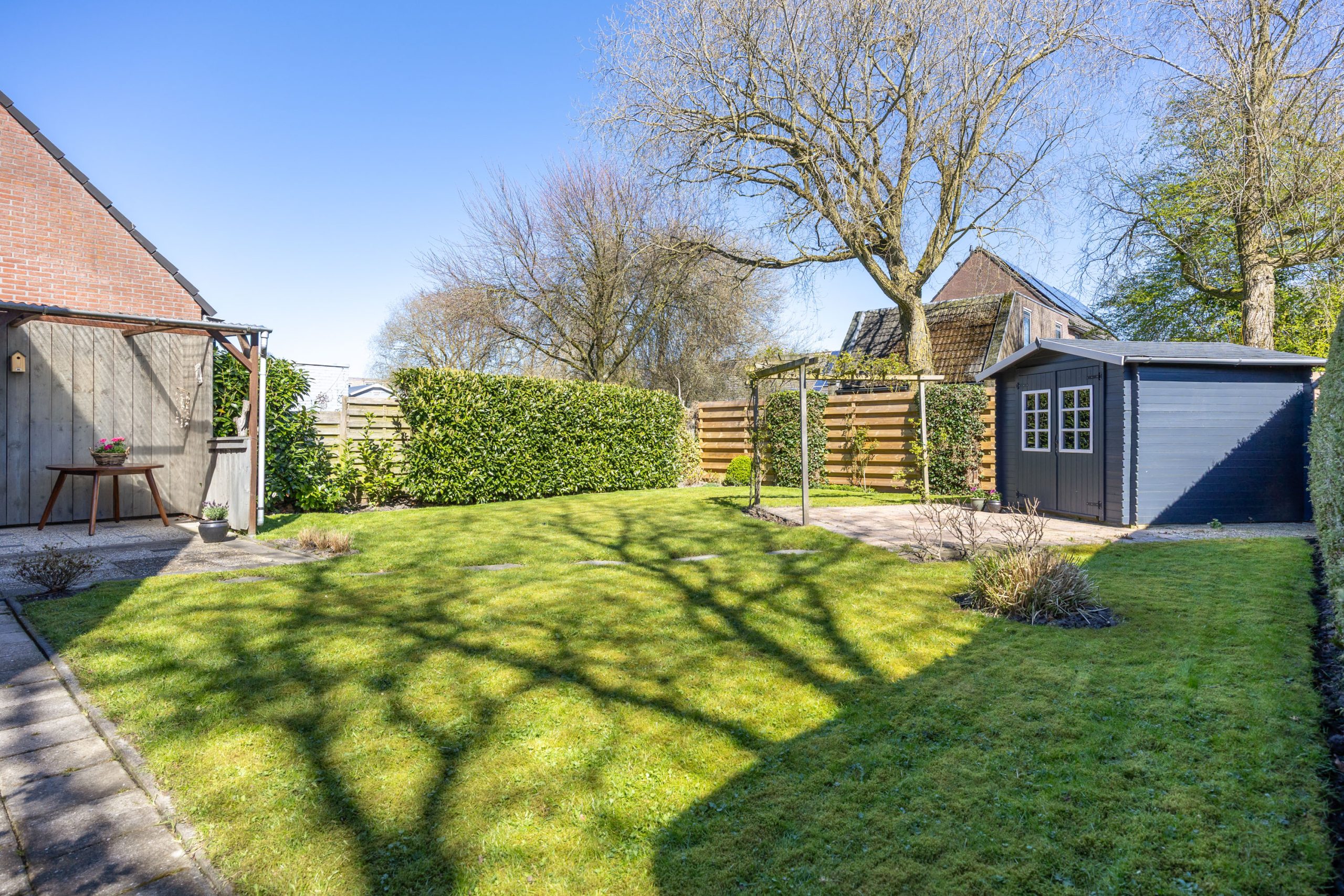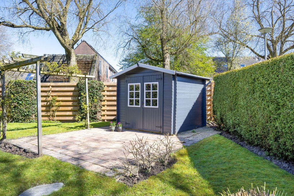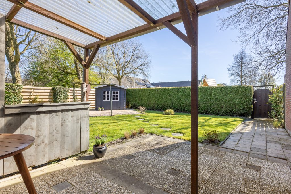 De zonnige, royaal besloten tuin is gesitueerd op het noordoosten, bestaat uit een terras, gazon, terrasoverkapping, een vrijstaande houten berging en beschikt over een achterom. De tuin kenmerkt zich door de verrassende ruimte en privacy.