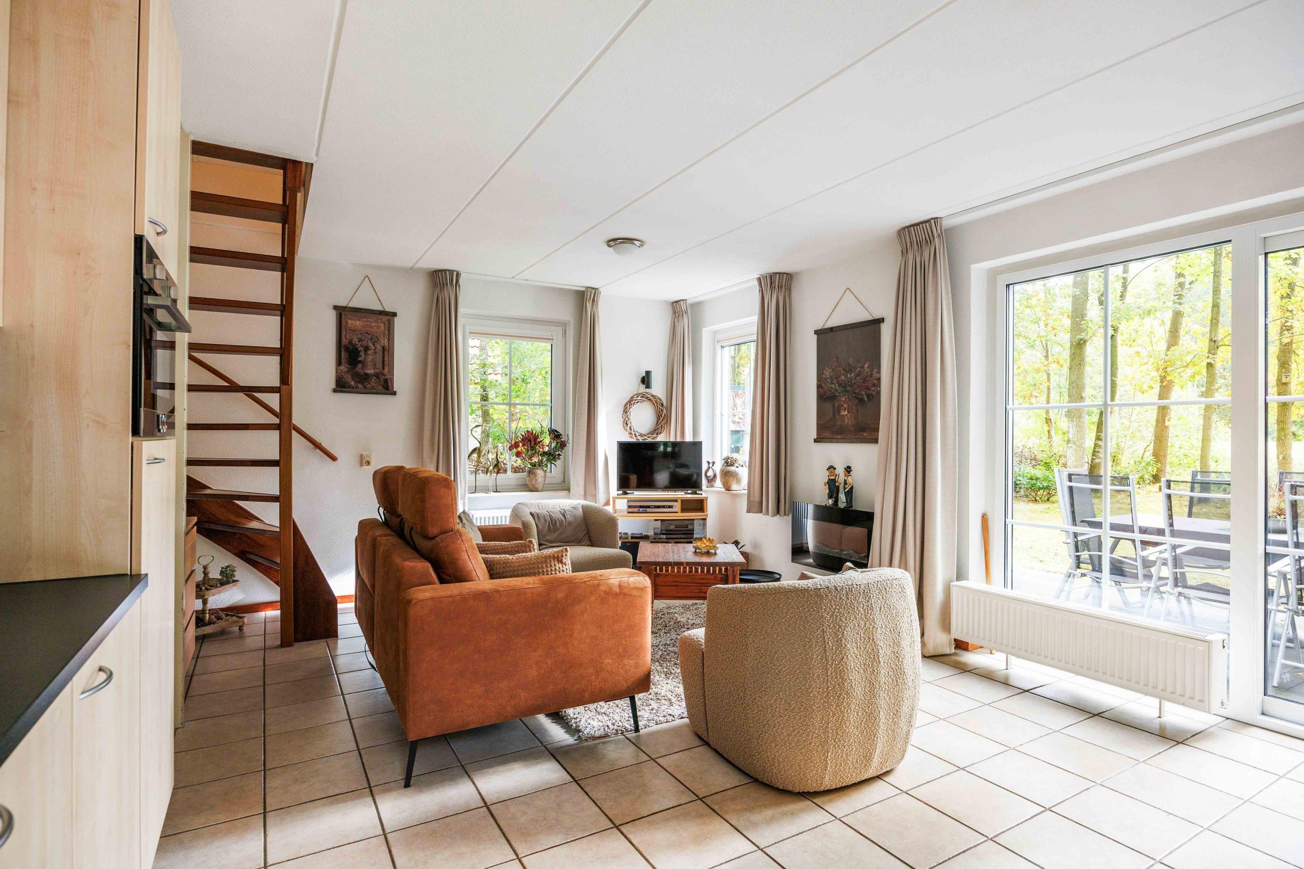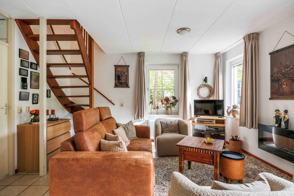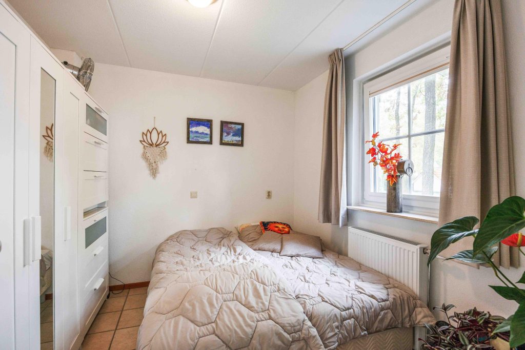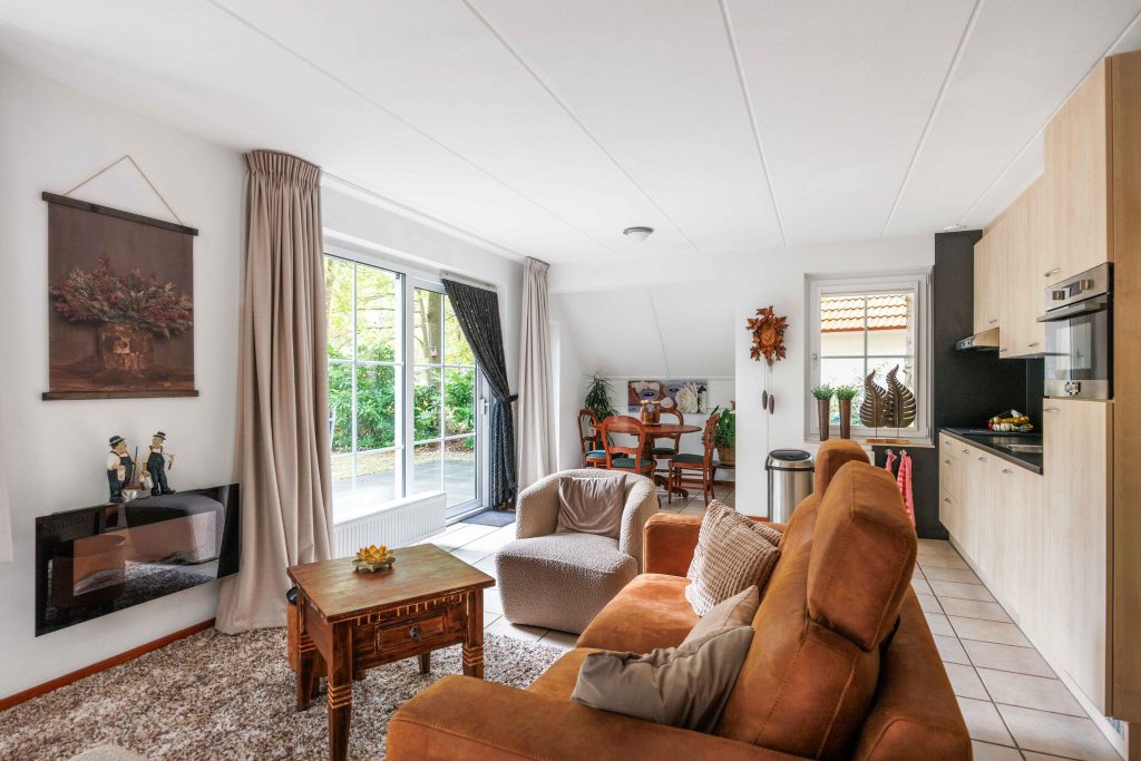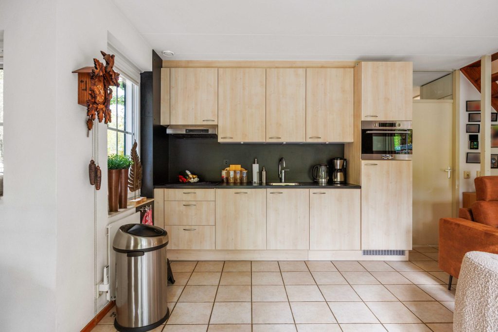 Vanuit de entree is er toegang tot het toilet, de nette badkamer met wastafelmeubel en inloopdouche, en de slaapkamer op de begane grond van circa 8,5m². Vervolgens kom je in de lichte, sfeervolle, tuingerichte woonruimte van ruim 30m² met een gezellige zithoek, rookkanaal en schuifpui naar de tuin. De moderne keuken (2022) is voorzien van een inductiekookplaat, vaatwasser, koelkast, afzuigkap en combimagnetron. Bovendien heb je vanuit deze leefruimte fraai zicht over de tuin en op de bosrand.