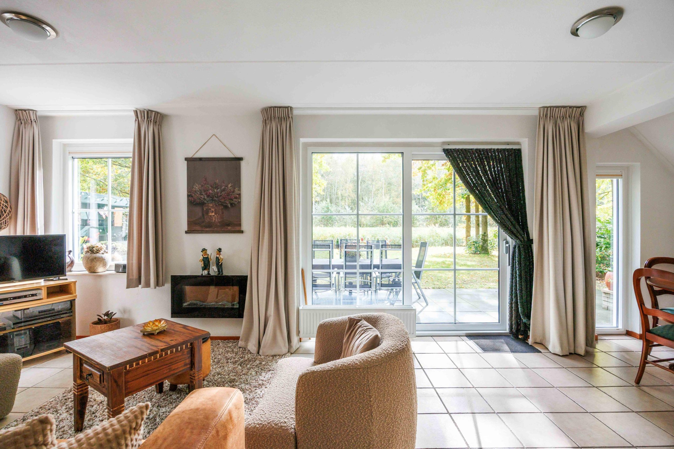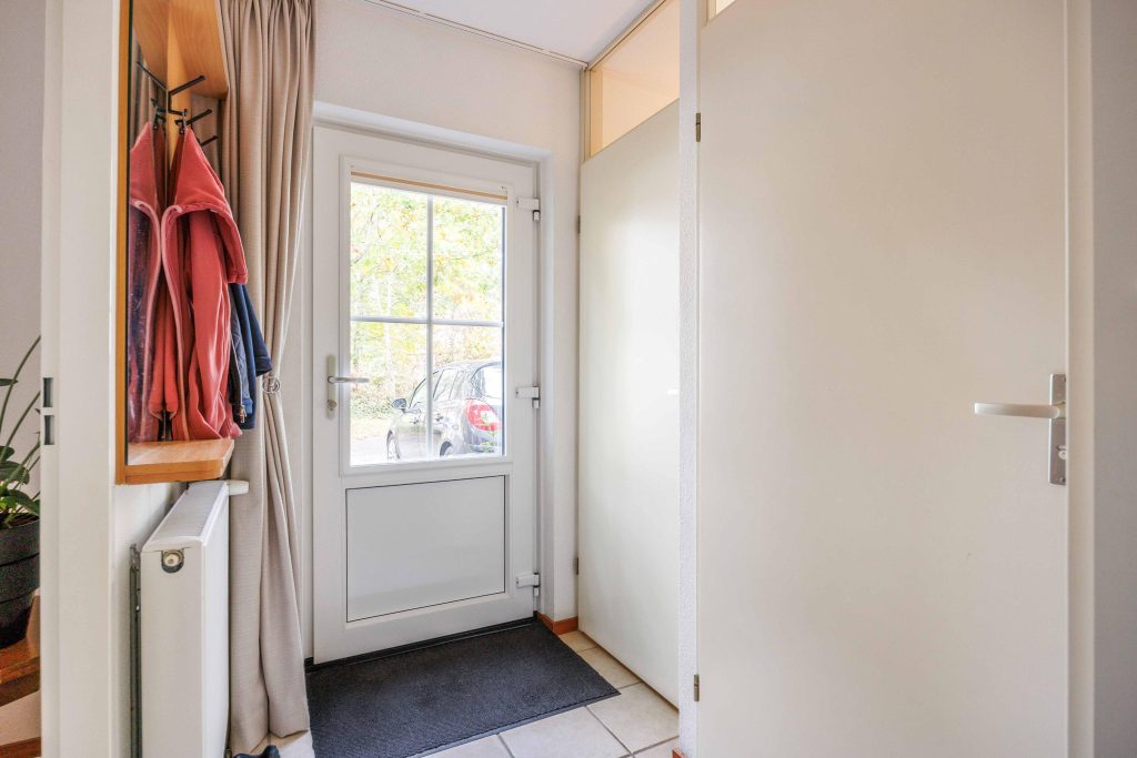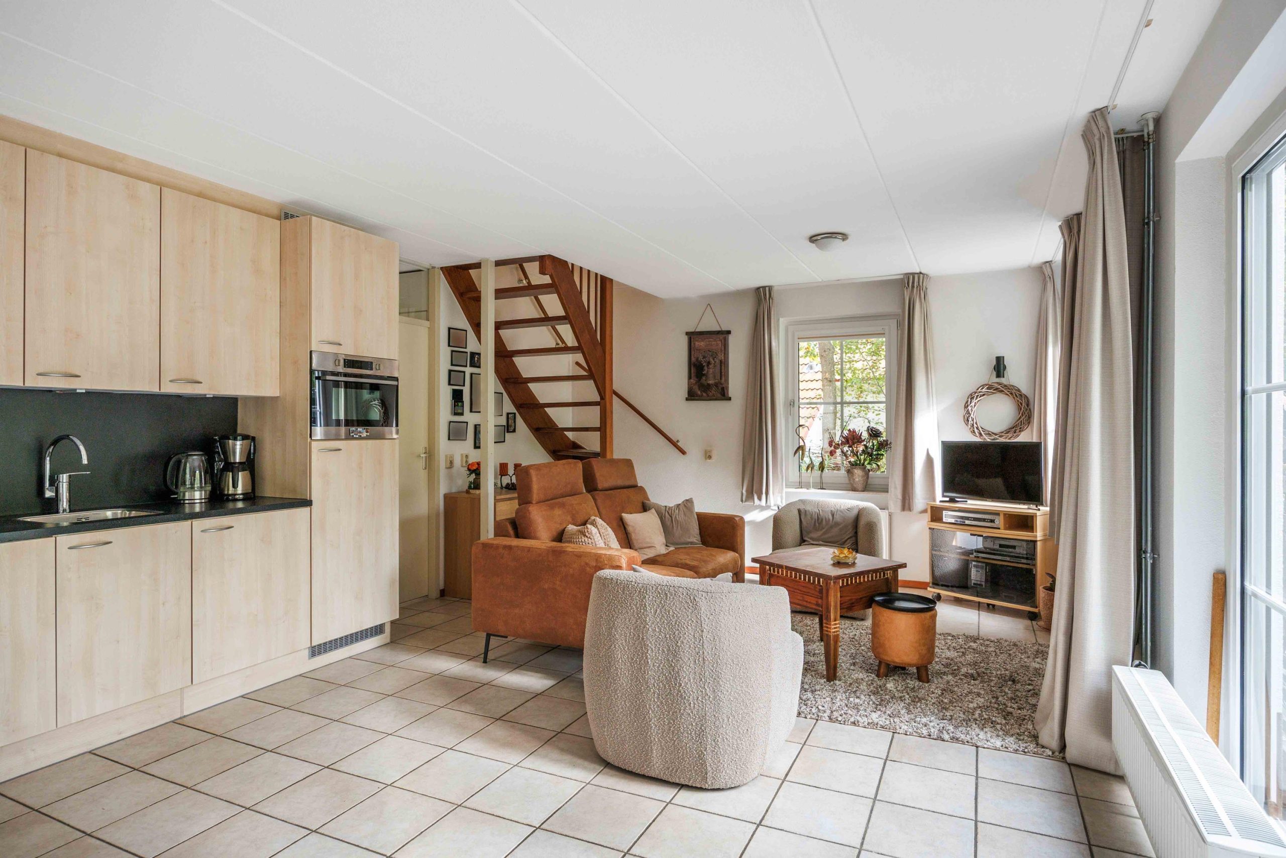 Vanuit de entree is er toegang tot het toilet, de nette badkamer met wastafelmeubel en inloopdouche, en de slaapkamer op de begane grond van circa 8,5m². Vervolgens kom je in de lichte, sfeervolle, tuingerichte woonruimte van ruim 30m² met een gezellige zithoek, rookkanaal en schuifpui naar de tuin. De moderne keuken (2022) is voorzien van een inductiekookplaat, vaatwasser, koelkast, afzuigkap en combimagnetron. Bovendien heb je vanuit deze leefruimte fraai zicht over de tuin en op de bosrand.