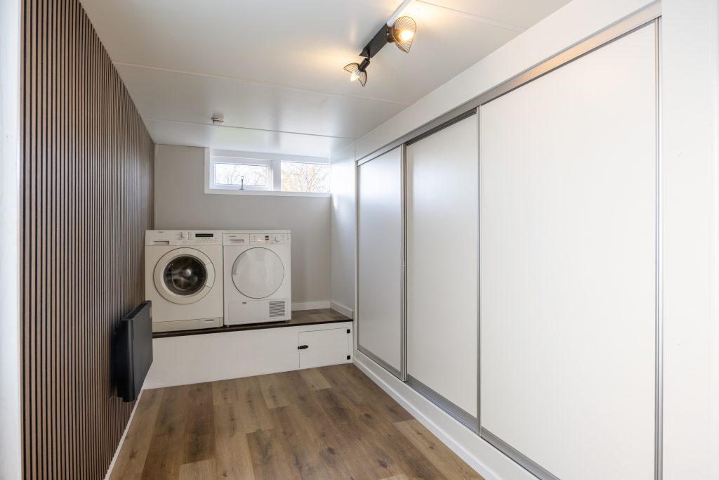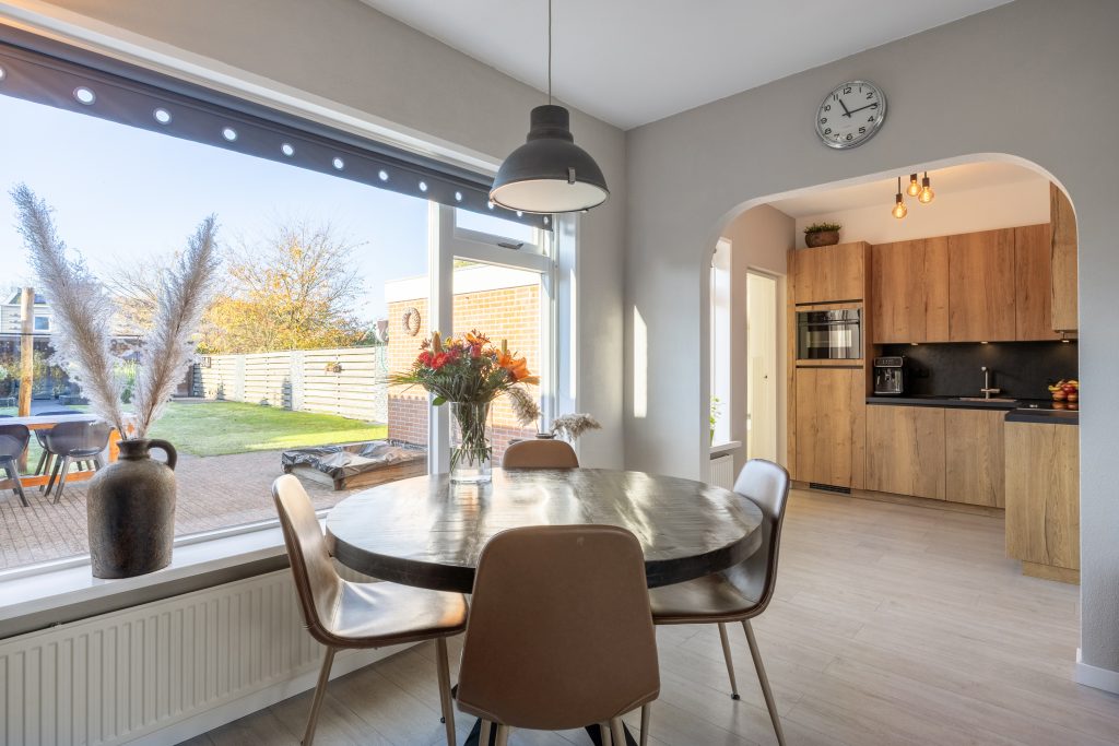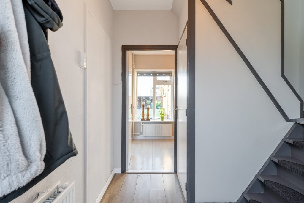 Via de entree/hal met meterkast, trapopgang, 6-traps kelder en keurig toilet, kom je in de lichte doorzon woonkamer met half open keuken, samen ca. 27m². De keuken is voorzien van een moderne keukeninrichting in hoekopstelling met inbouwapparatuur, waaronder een inductie kookplaat, afzuigkap, vaatwasser, oven en koelkast. Aansluitend bevindt zich de ruime, volledig geïsoleerde bijkeuken/berging met achterdeur, extra bergruimte en witgoedaansluitingen op hoogte.