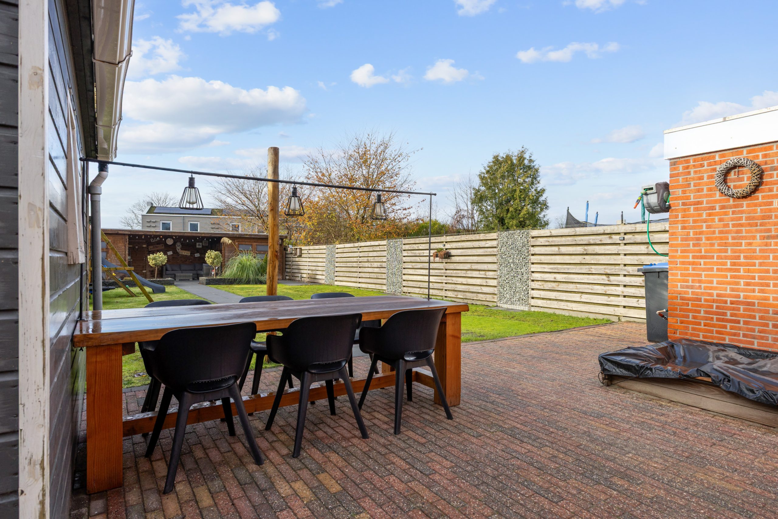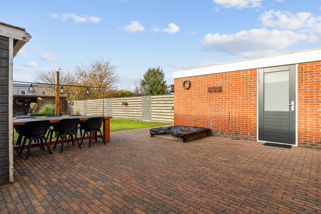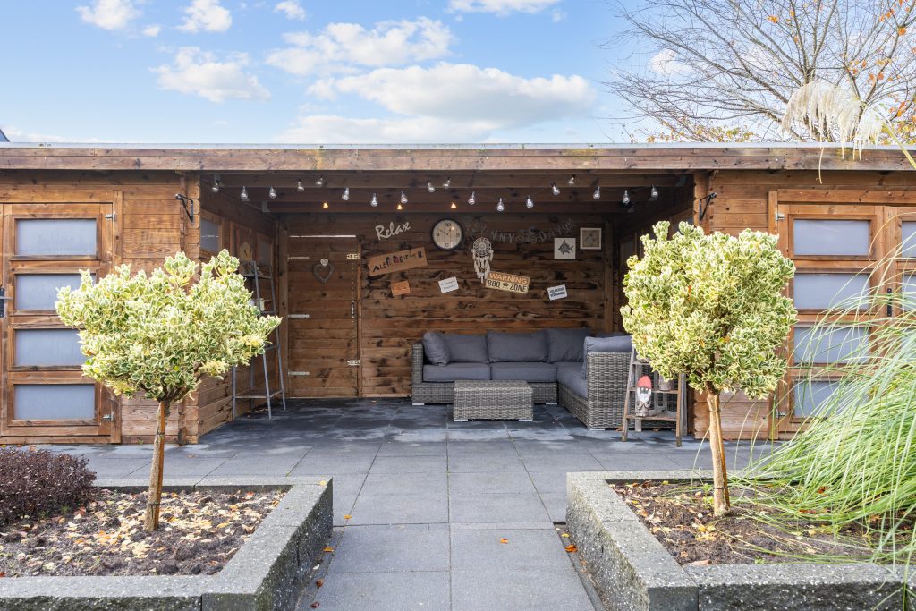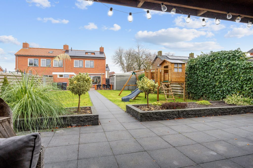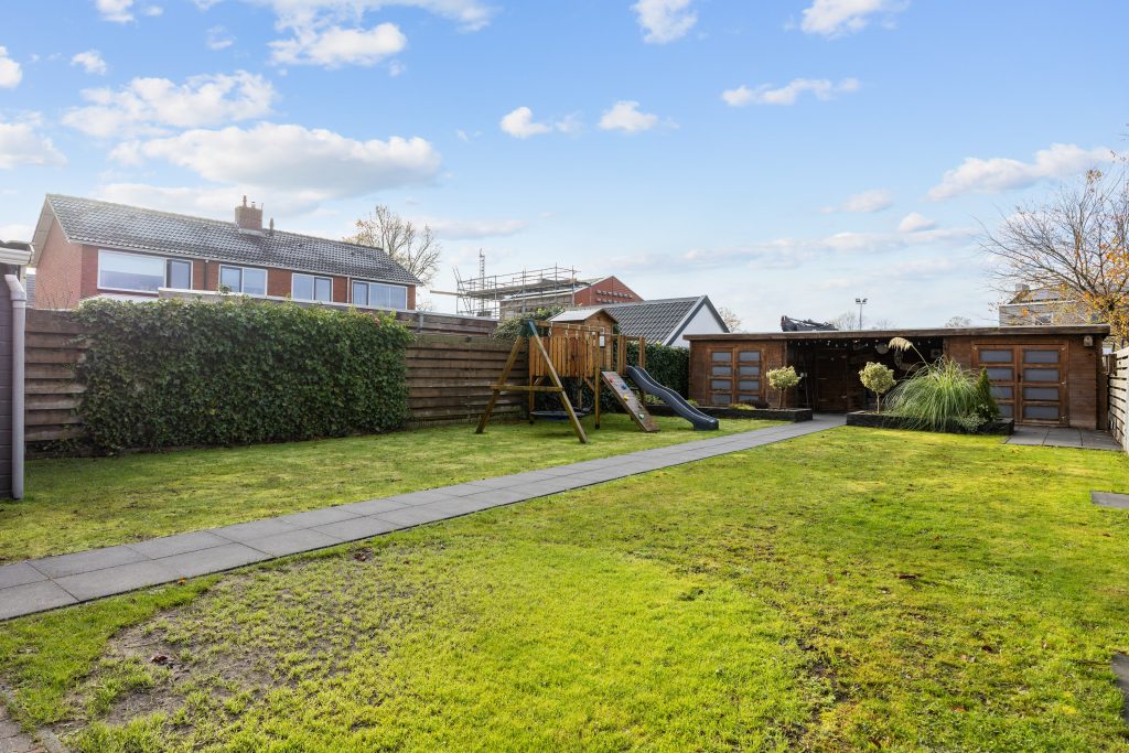 De verrassend grote tuin is gelegen op het noordwesten, beschikt over een achterom en bestaat uit terras, borders en een royaal gazon. Daarnaast is er een ruime houten berging en is er de gezellige veranda/ terrasoverkapping tevens met extra bergruimte. Dankzij de ligging, met directe achterburen op afstand, geniet je hier van veel privacy en -door de diepte van de tuin- de gehele dag de zon.