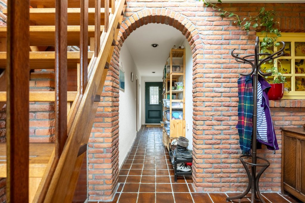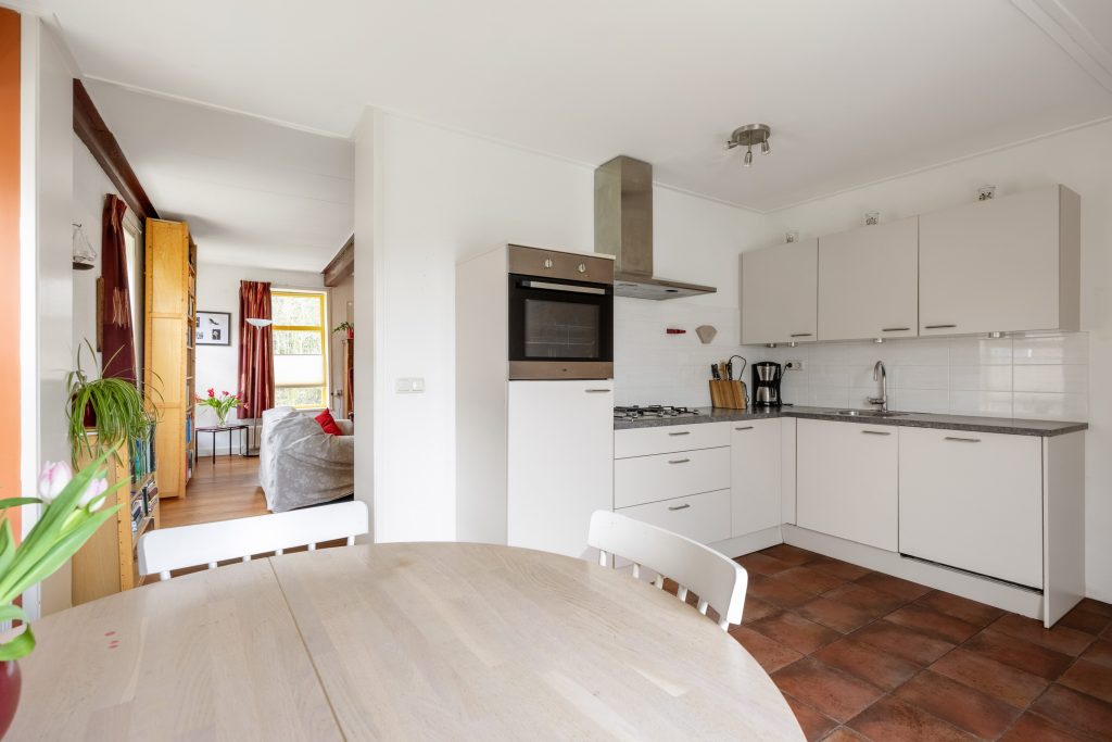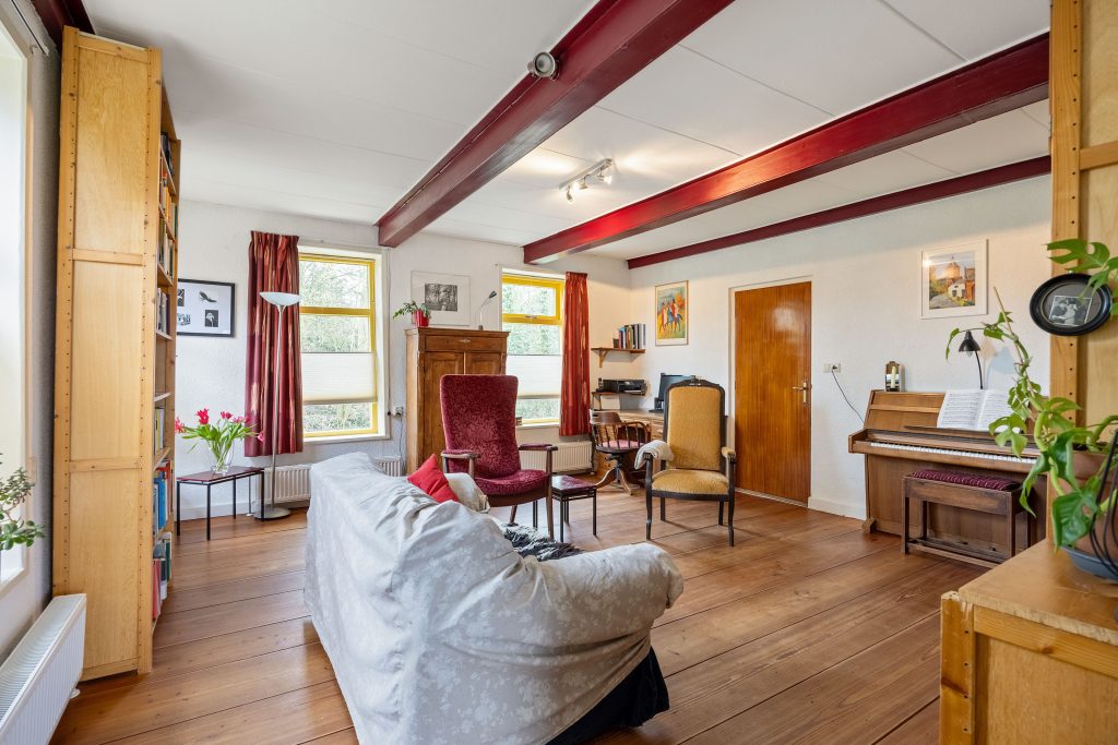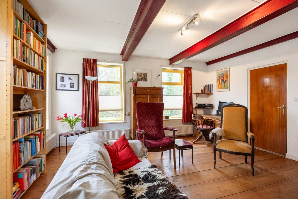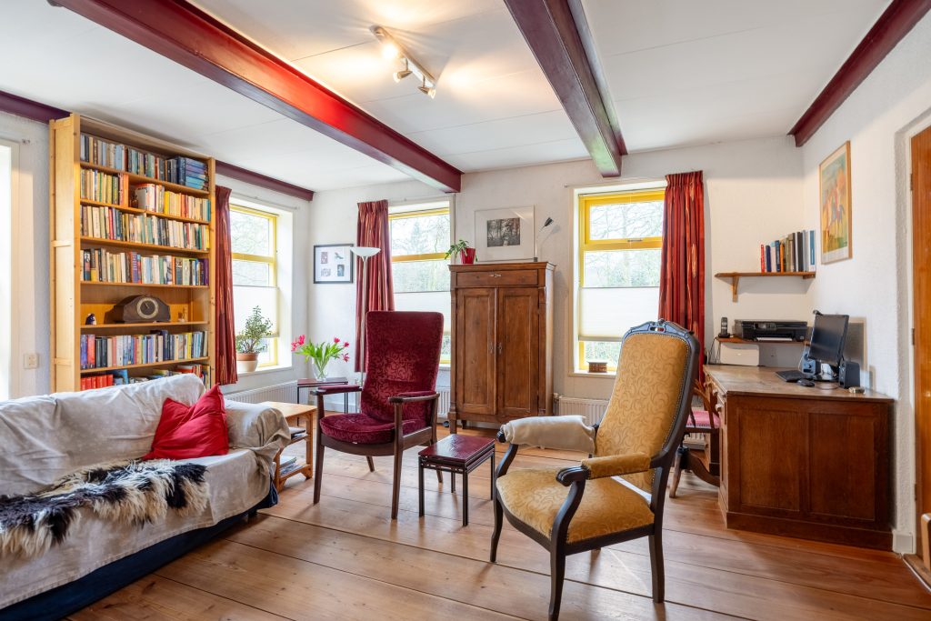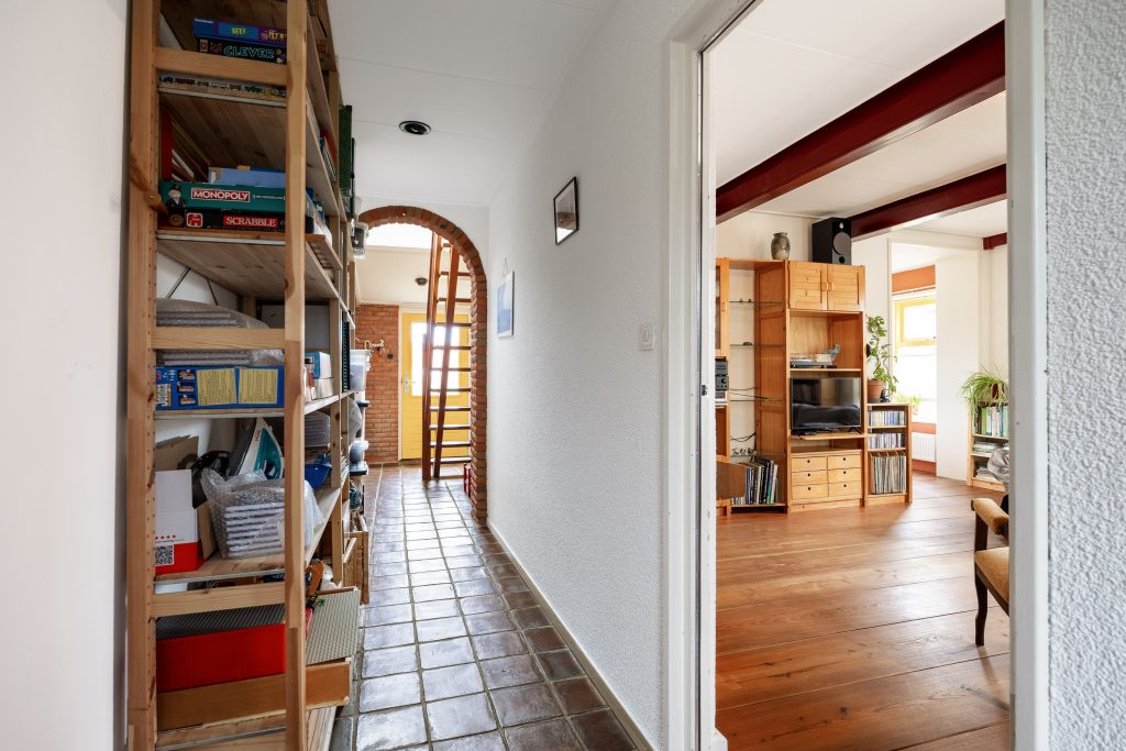 Bij binnenkomst door de voordeur kom je in de centrale gang met o.a. toegang tot de woonkamer. Deze ruime, sfeervolle kamer van ca. 27 m² heeft uitzicht op groen en een balkenplafond. Aangrenzend tref je de woonkeuken van ca. 14 m², met een nette keukeninrichting in hoekopstelling, voorzien van inbouwapparatuur zoals een 4-pits kookplaat, afzuigkap, vaatwasser, koelkast en oven. Vanuit de keuken is er toegang tot de ruime achterhal met o.a. de trapopgang en een deur naar zowel de tuin als de oprit. Tevens bevinden zich hier de witgoedruimte, het toilet en de badkamer (2013) met inloopdouche en wastafel. Tot slot is er de slaapkamer op de begane grond van ca. 23 m², met schouw en balkenplafond.