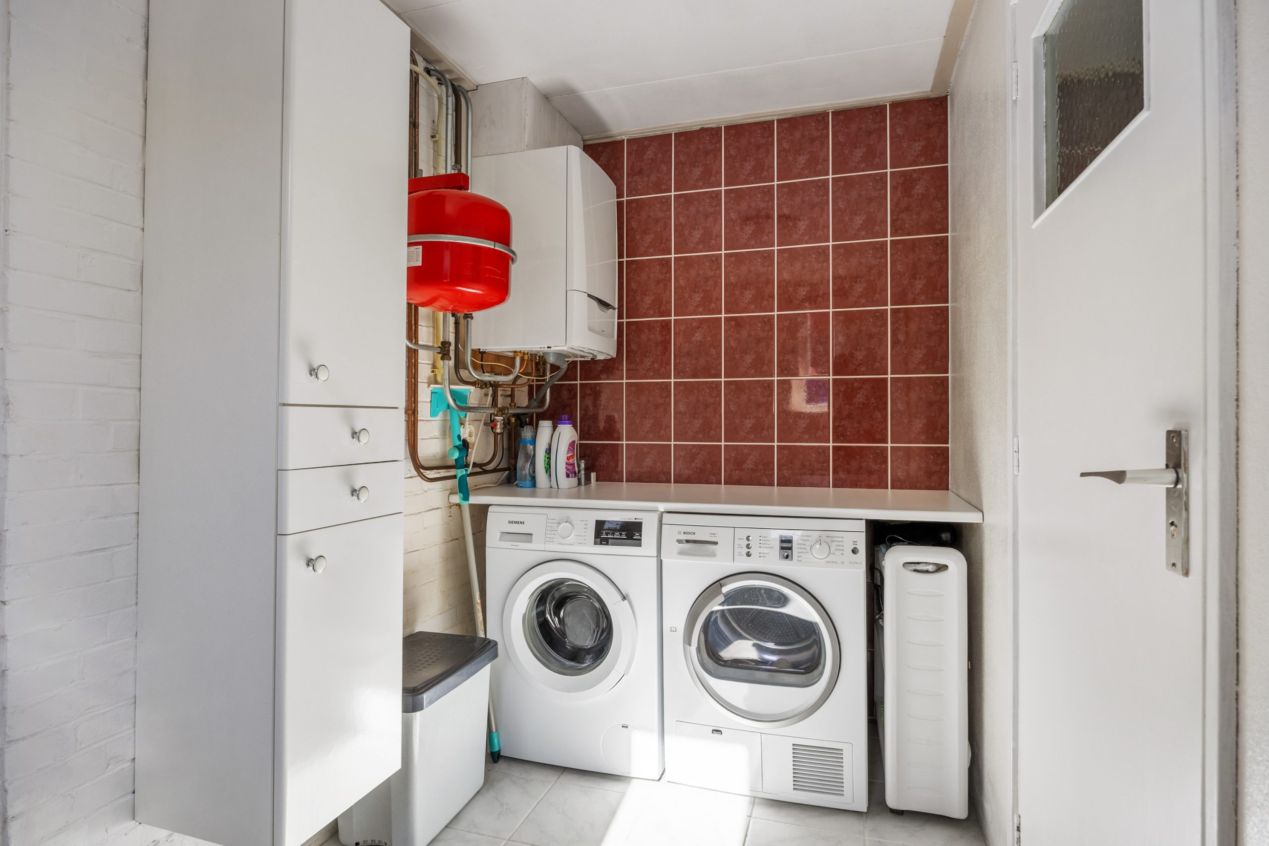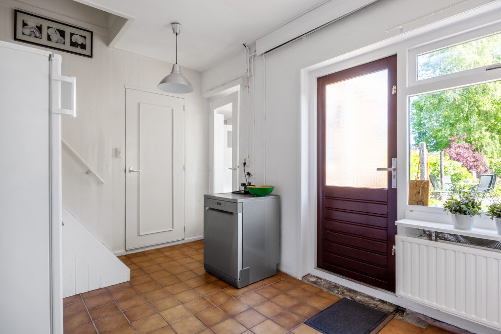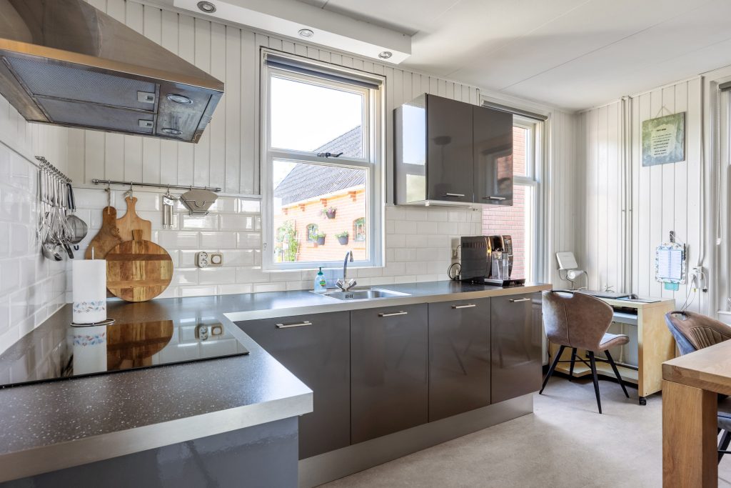 Vanuit de keuken bereikt u het achterhuis (ongeveer 11 m²), waar zich tevens de toegang tot de kelder bevindt (ca. 4 m²). De praktische bijkeuken van circa 5 m² beschikt over een wasmachineaansluiting en de Remeha HR-combiketel (2020). De badkamer (ca. 2 m²) is compact maar functioneel en voorzien van een douche en vaste wastafel. Het toilet is separaat en beschikt over een wandcloset en een wastafel.