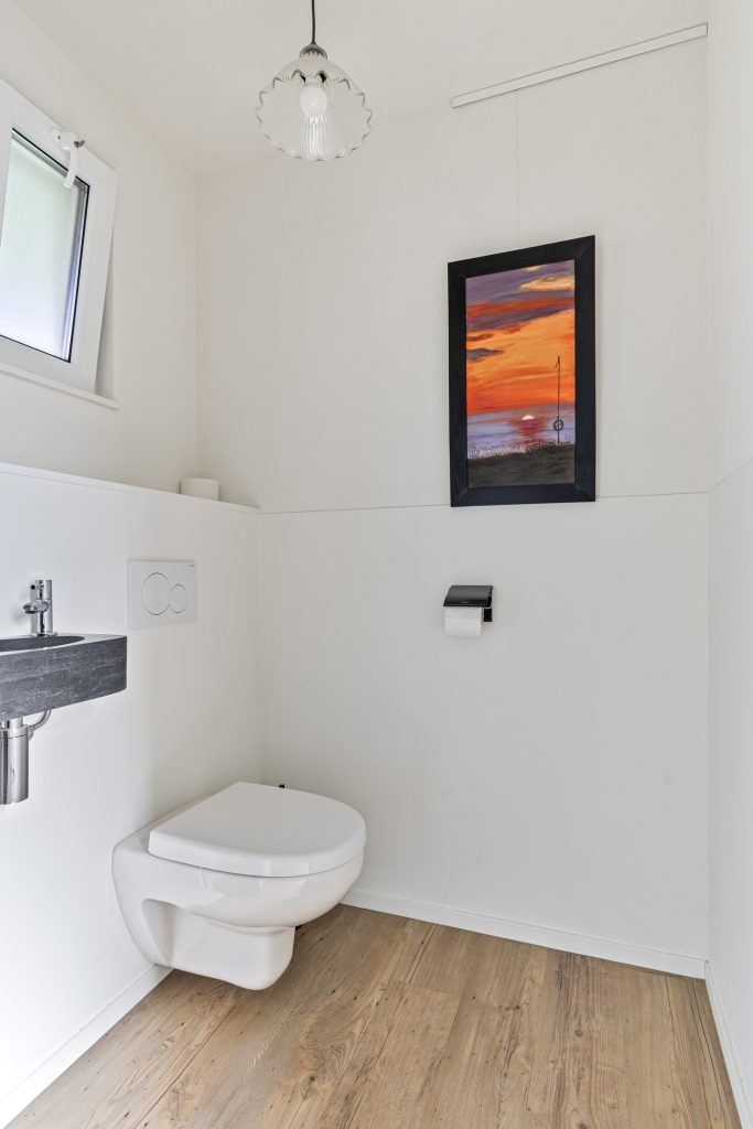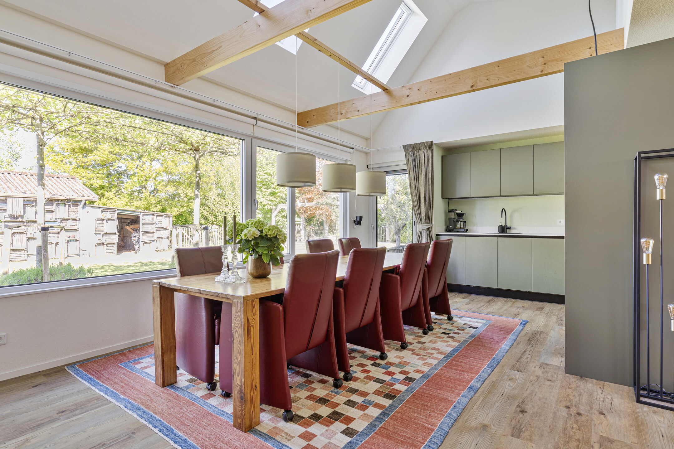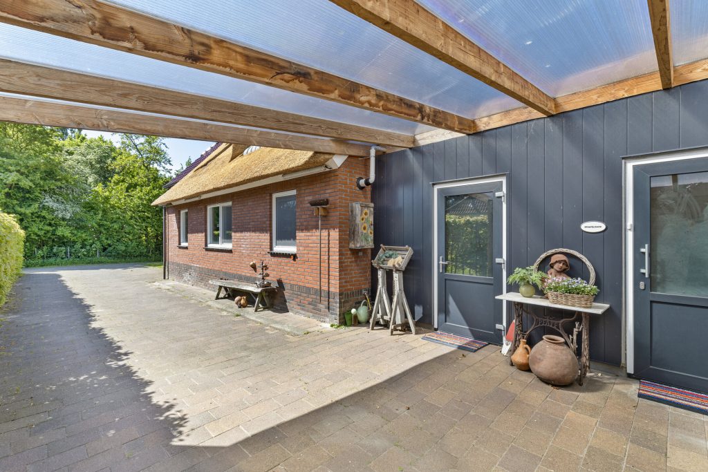 Vanuit de zijentree met trapopgang en ruim toilet heeft u toegang tot de voor-/ slaapkamer aan de voorzijde van ca. 18,5m² met eigen badkamer voorzien van inloopdouche, wastafel en waterontharder. Vervolgens kom je in de heerlijk Z-vormige leefruimte van bijna 50m² bestaande uit een echte woonkeuken en een gezellige living. De woonkeuken van ca. 23m² beschikt over een moderne keukeninrichting in hoekopstelling voorzien van inbouwapparatuur zoals een inductiekookplaat (2020), afzuigkap, vaatwasser op hoogte, combi-magnetron (2020) en koelkast. Tevens is er een ruime inloop-/ voorraadkast. De sfeervolle woonkamer/ living van ca. 24,5m² heeft o.a. openslaande deuren naar het terras en vanuit deze ruimte is er vrij zicht over de tuin en weidegroen. Aansluitend aan de keuken kom je in de ruime bijkeuken met o.a. witgoed op hoogte, praktische bergruimte en de achterhal met kastruimte en deur naar zowel het terras/ de tuin als naar de oprit rechts van de woning met ruime carport. Bovendien is de gehele begane grond voorzien van vloerverwarming.