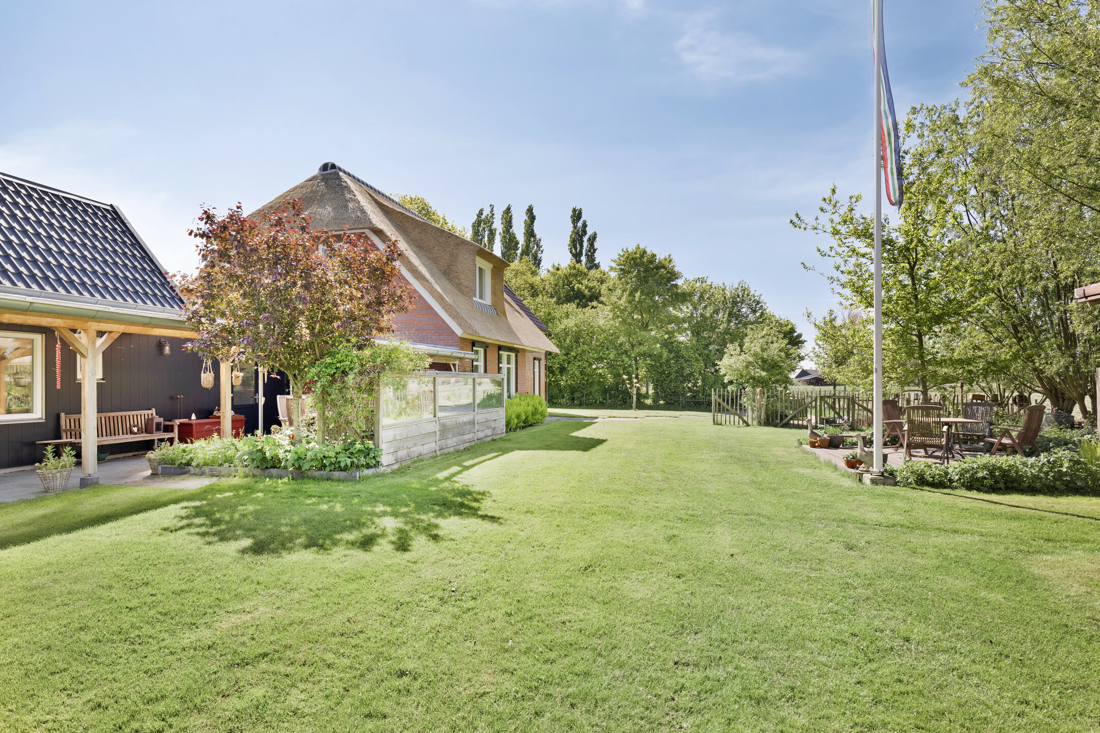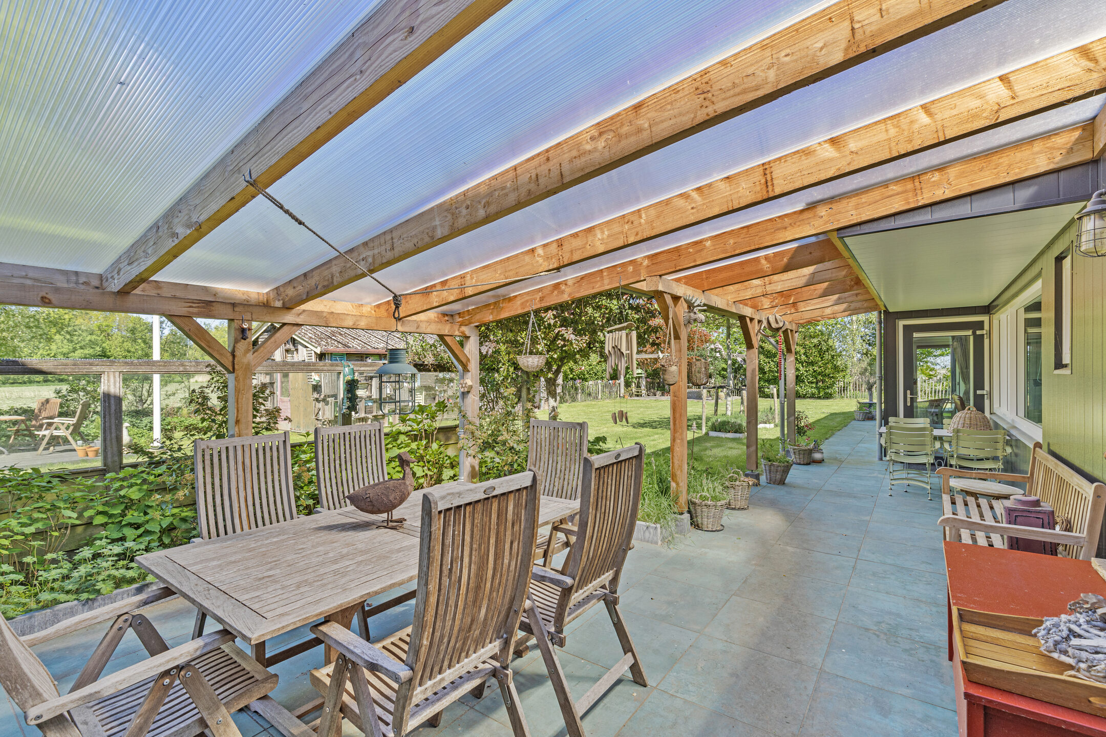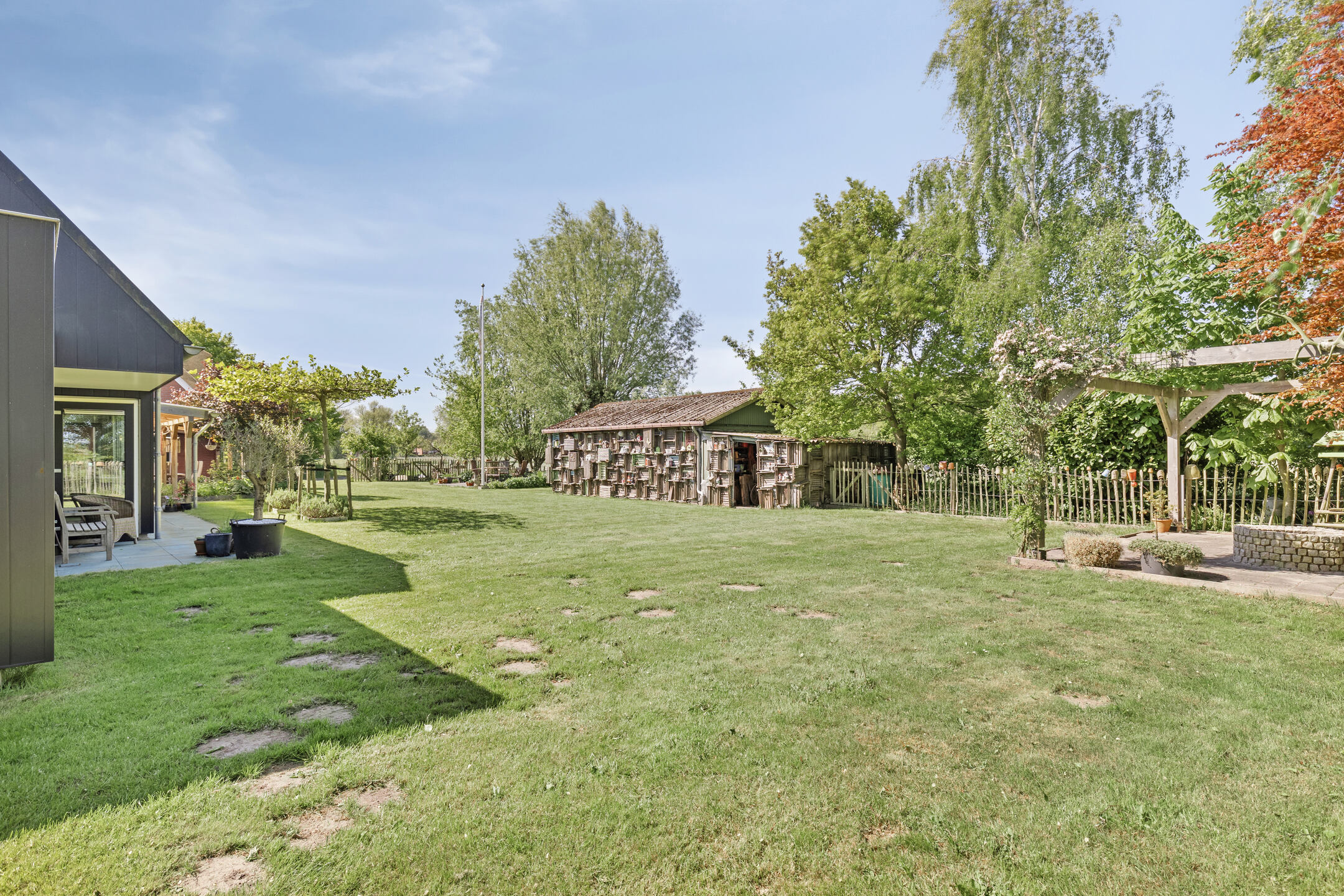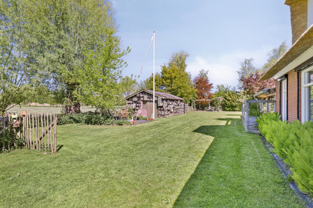 De heerlijke, besloten tuin op het westen, biedt u veel privacy, heeft vrij zicht over weidegrond en maakt het totale plaatje geheel compleet. Deze geweldige tuin beschikt over een prachtige veranda/ terrasoverkapping aan de woning en bestaat voornamelijk uit gazon, borders, terras en bomen. Een heerlijke plek om te ontspannen en om bijvoorbeeld onder de veranda samen met familie en vrienden te genieten van een heerlijk BBQ of een zwoele zomeravond. Bovendien is er nog de beschikking over een houten schuurruimte met houtstek.