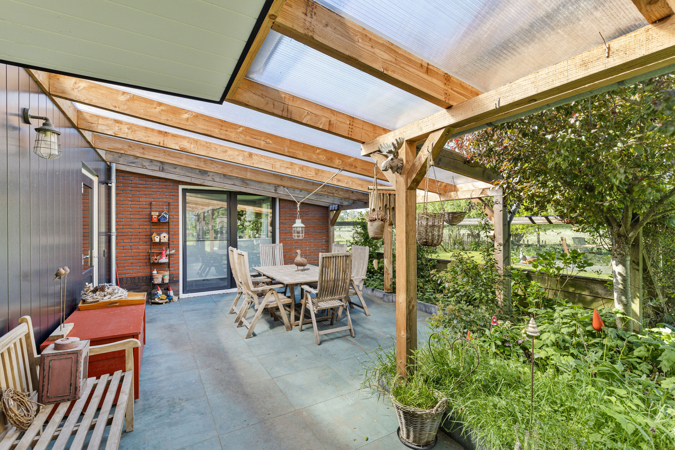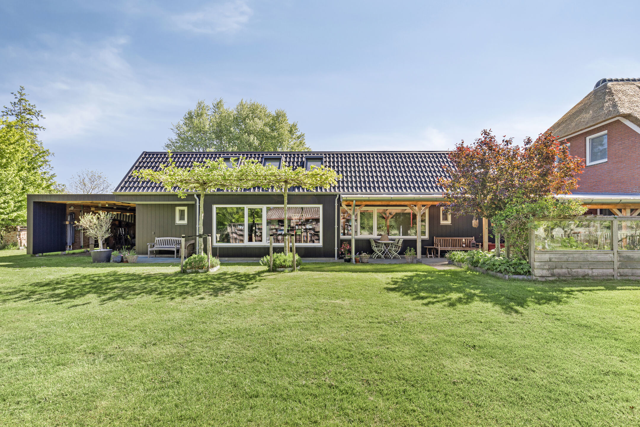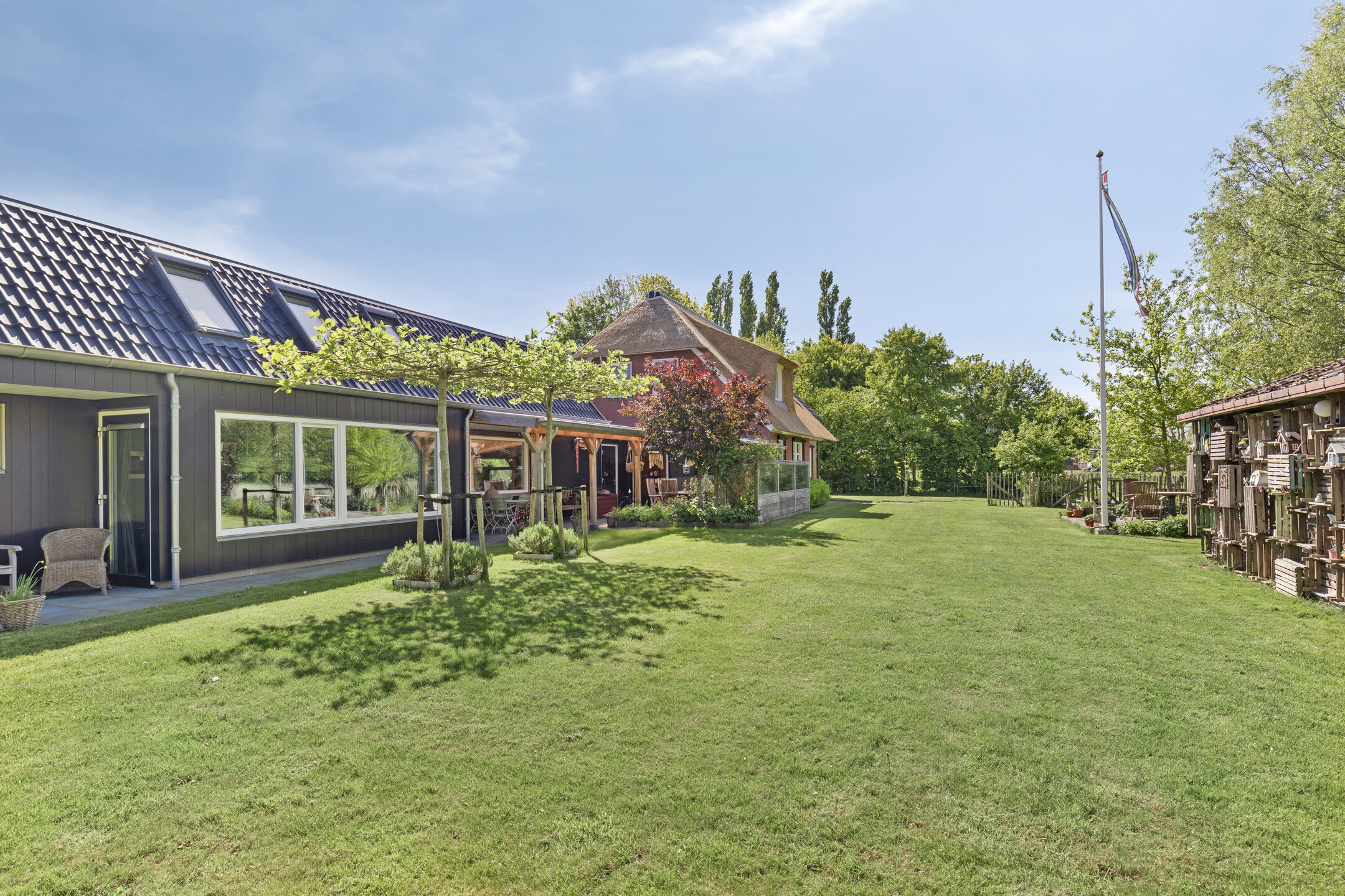 De heerlijke, besloten tuin op het westen, biedt u veel privacy, heeft vrij zicht over weidegrond en maakt het totale plaatje geheel compleet. Deze geweldige tuin beschikt over een prachtige veranda/ terrasoverkapping aan de woning en bestaat voornamelijk uit gazon, borders, terras en bomen. Een heerlijke plek om te ontspannen en om bijvoorbeeld onder de veranda samen met familie en vrienden te genieten van een heerlijk BBQ of een zwoele zomeravond. Bovendien is er nog de beschikking over een houten schuurruimte met houtstek.
