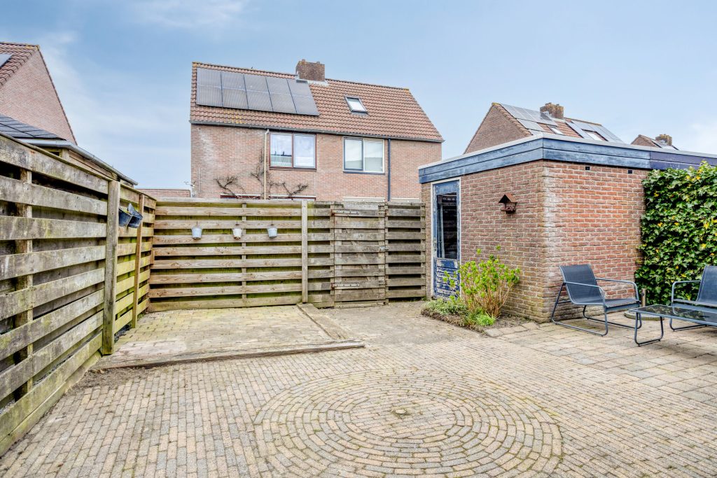 De zonnige tuin is gesitueerd op het noordwesten, is volledig bestraat en beschikt over een achterom en een stenen fietsenberging. De tuin kenmerkt zich door een besloten, zonnige ligging.